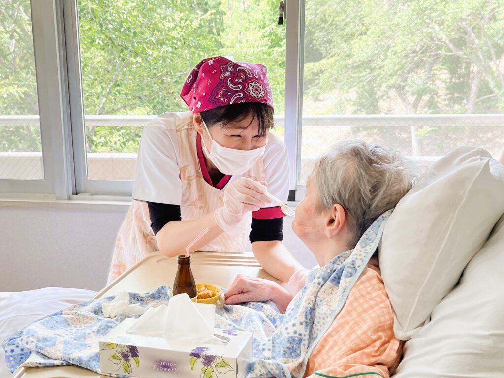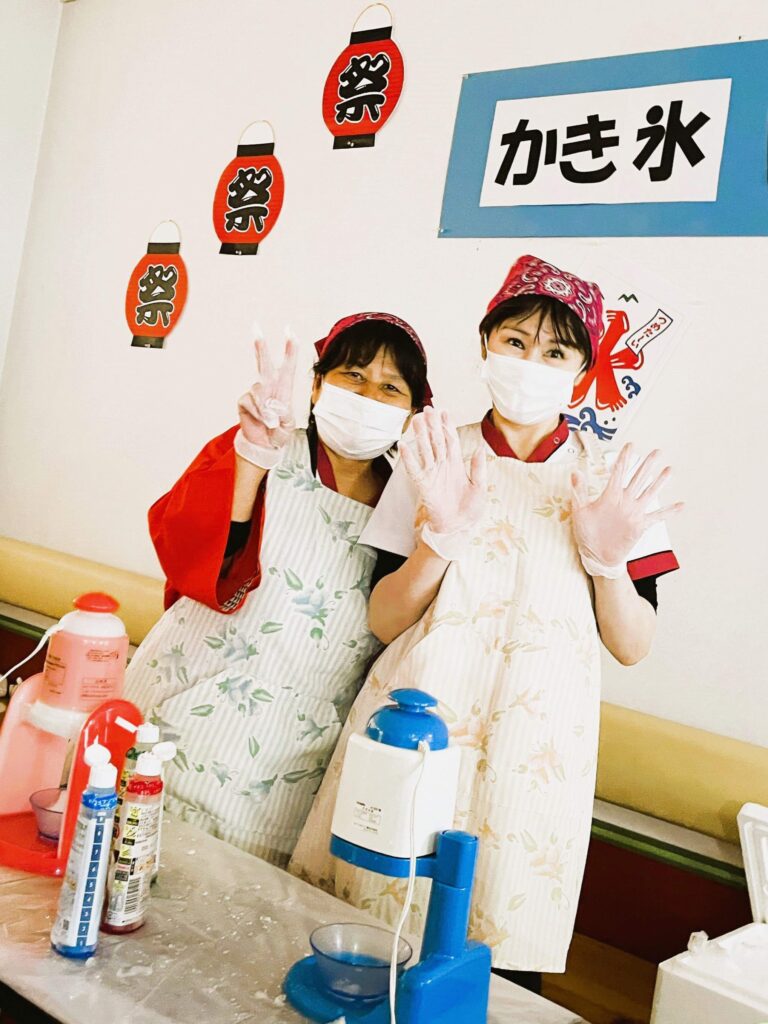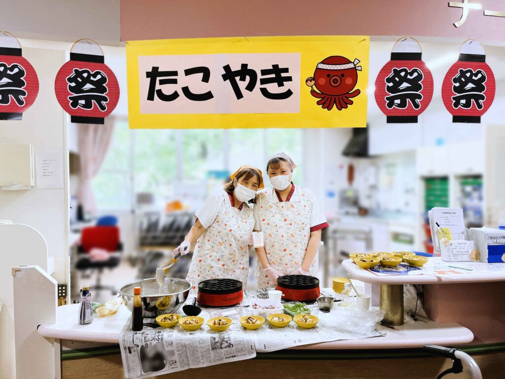 病室におられる患者さまにも、お祭り気分を味わっていただこうと、たこ焼きとかき氷の出前をお届けしました。おいしそうに召し上がるお姿を見て、スタッフ一同とても嬉しく思いました。