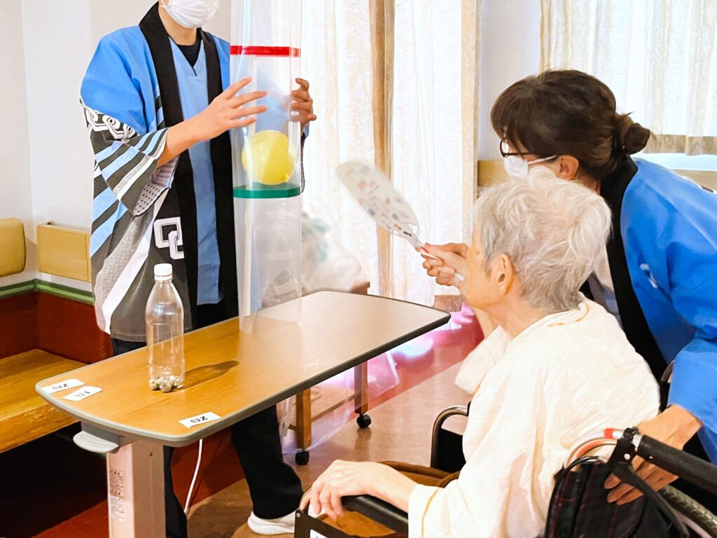 患者さまが手作りの団扇を使い、風船を長い筒から出すゲームです。