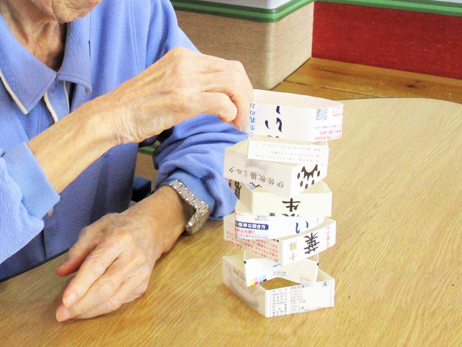 大盛り上がりの ひなまつり ~こんごう棟2階~ 2022.04.14 お知らせ ゲームを2つ行いました。 1つ目は2センチの幅に輪切りにした牛乳パックを高く積むゲーム。 適度な柔らかさがあるので思うように詰めず夢中になっておられました。 2つ目の風船バレーでは手、足だけでなく頭を出そうとされる方もおられ笑い声の絶えない対戦でした。 広報誌「りんご便り4月号」より