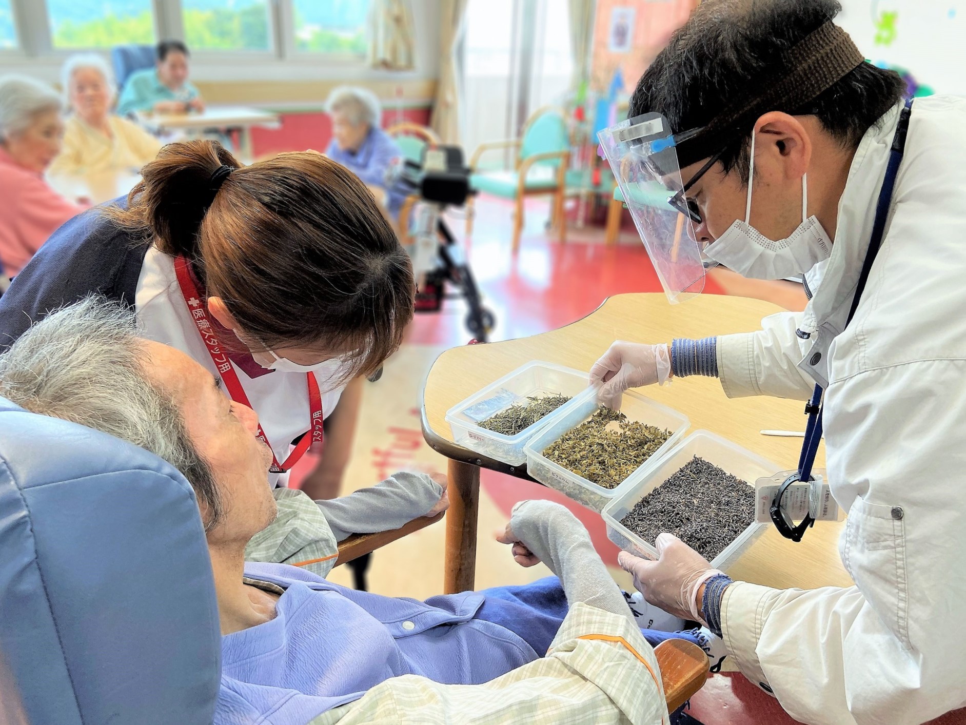 完成したものの使い方は人それぞれ。ベッドサイドに飾る方やずっと握っておられる方、奥さまにプレゼントをするとおっしゃる方もおられました。ハーブの効果でしょうか、「いい香り~」「この匂いはちょっときついわ」など、話が弾んで笑いの絶えないひとときとなりました。