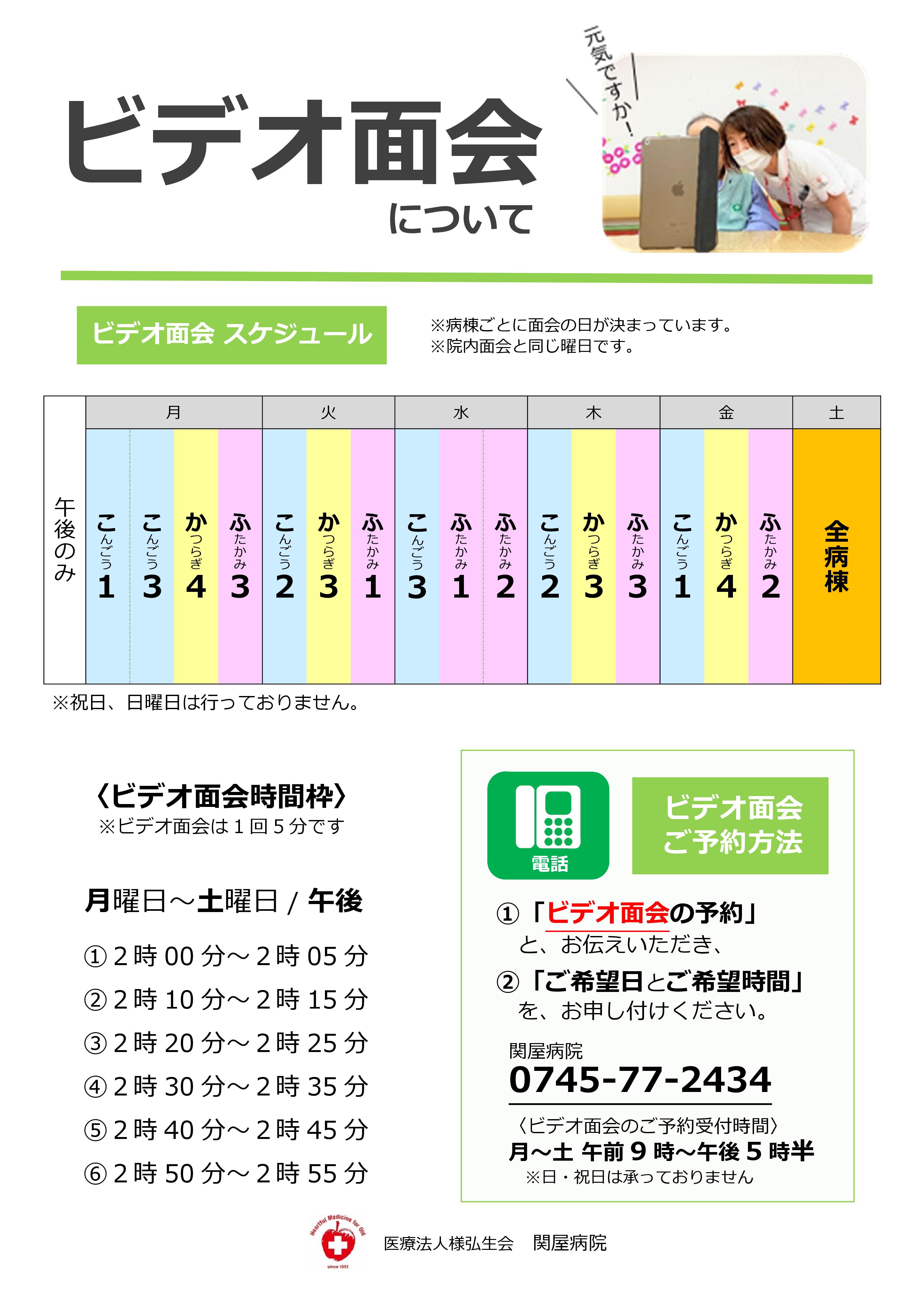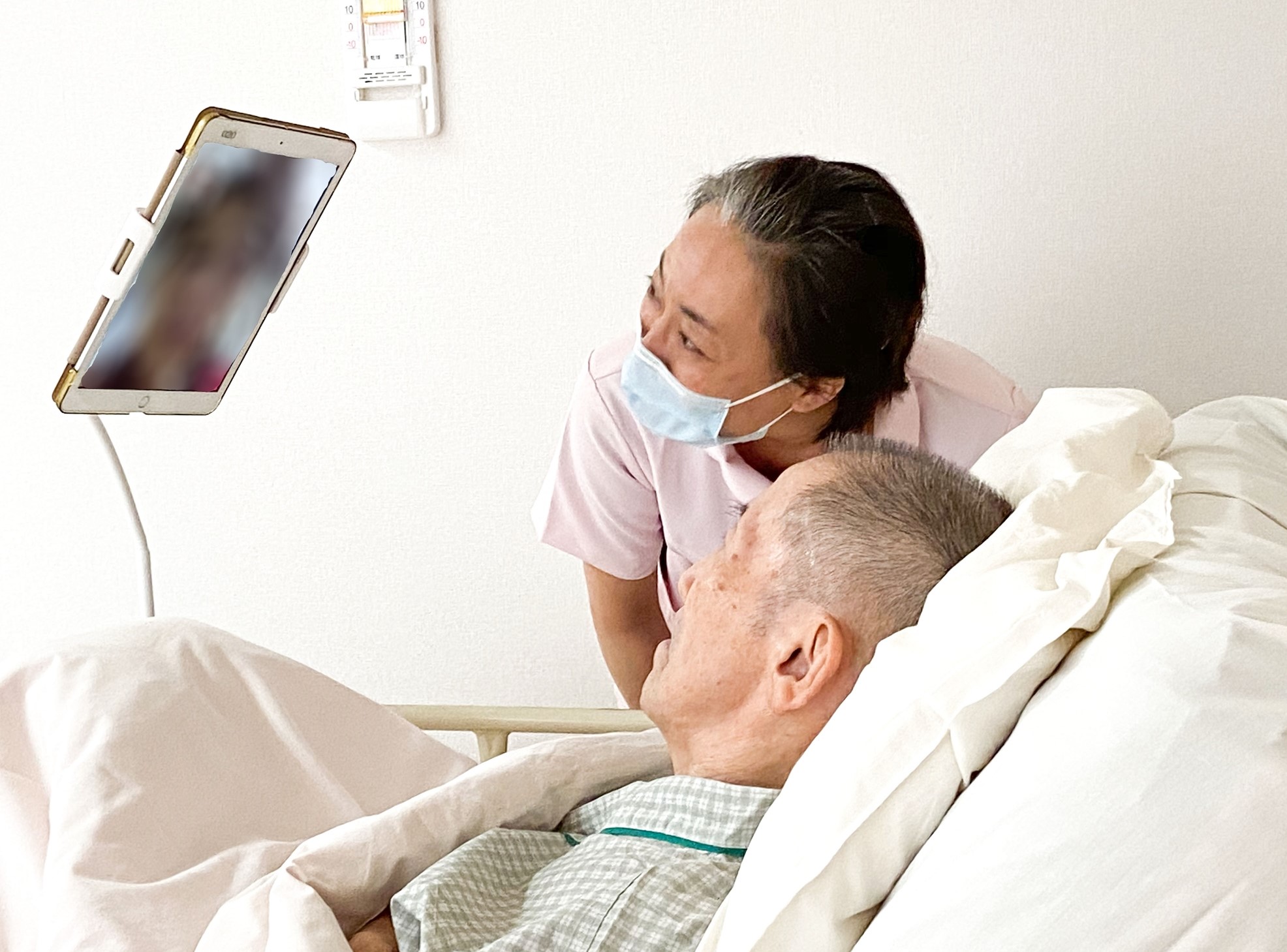 好評実施中 ~ビデオ面会~ 2021.11.10 お知らせ 《 お互いにマスク不要です ビデオ面会 》 マスクを外して会話ができるのでお互いの表情がよくわかります。 遠方にお住まいの方や小さなお子さまがおられる方、ペットと一緒に面会をご希望される方など、よろしければご利用ください。 ビデオ面会の詳細についてはこちらをご覧ください↓