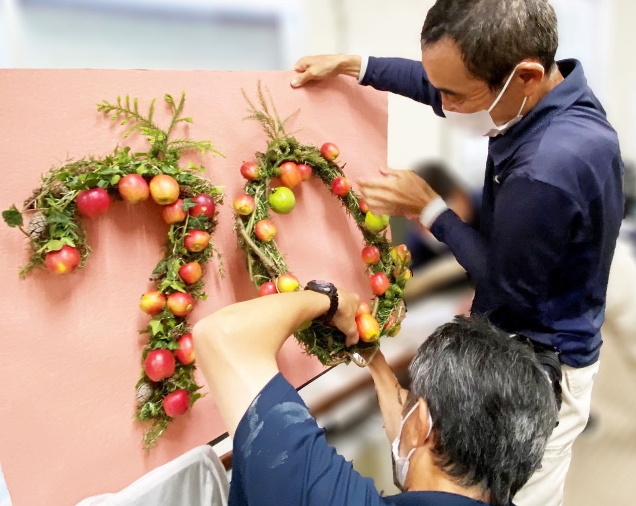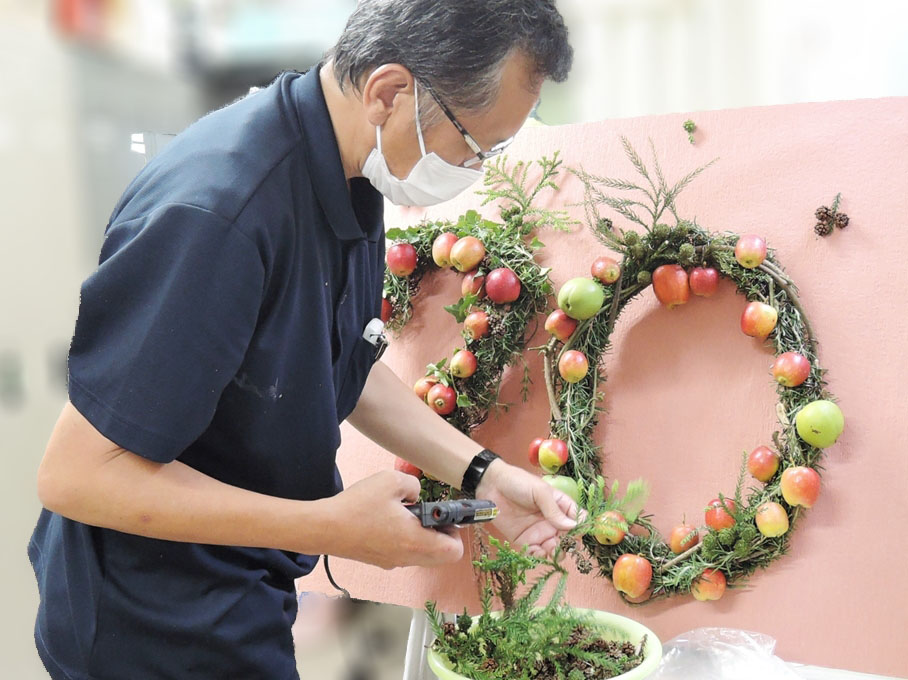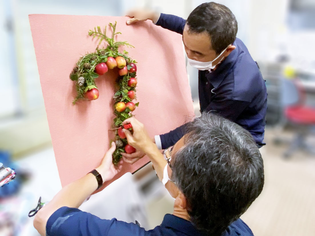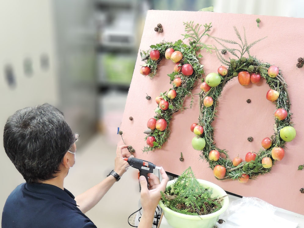 りんご広場にある姫りんごを使って、創立70周年の「70」の文字を作ることに。