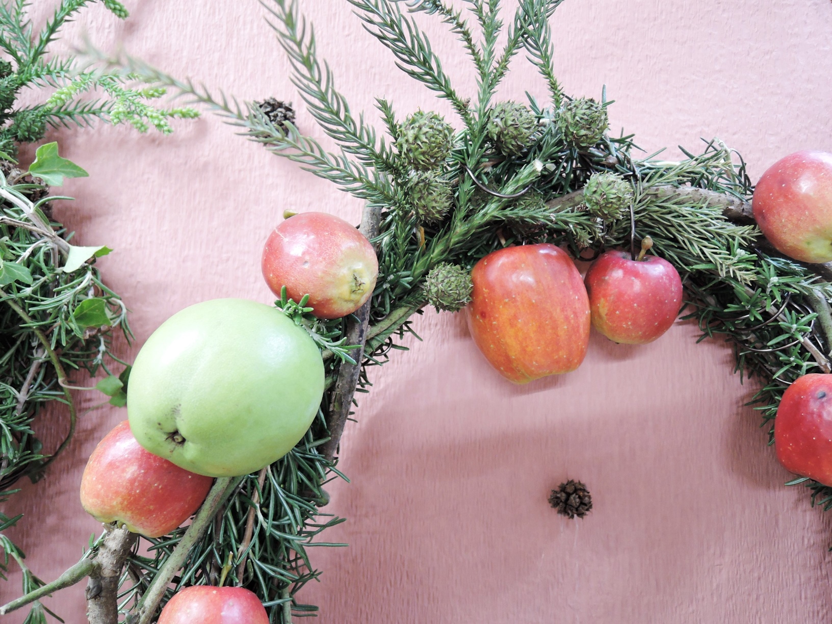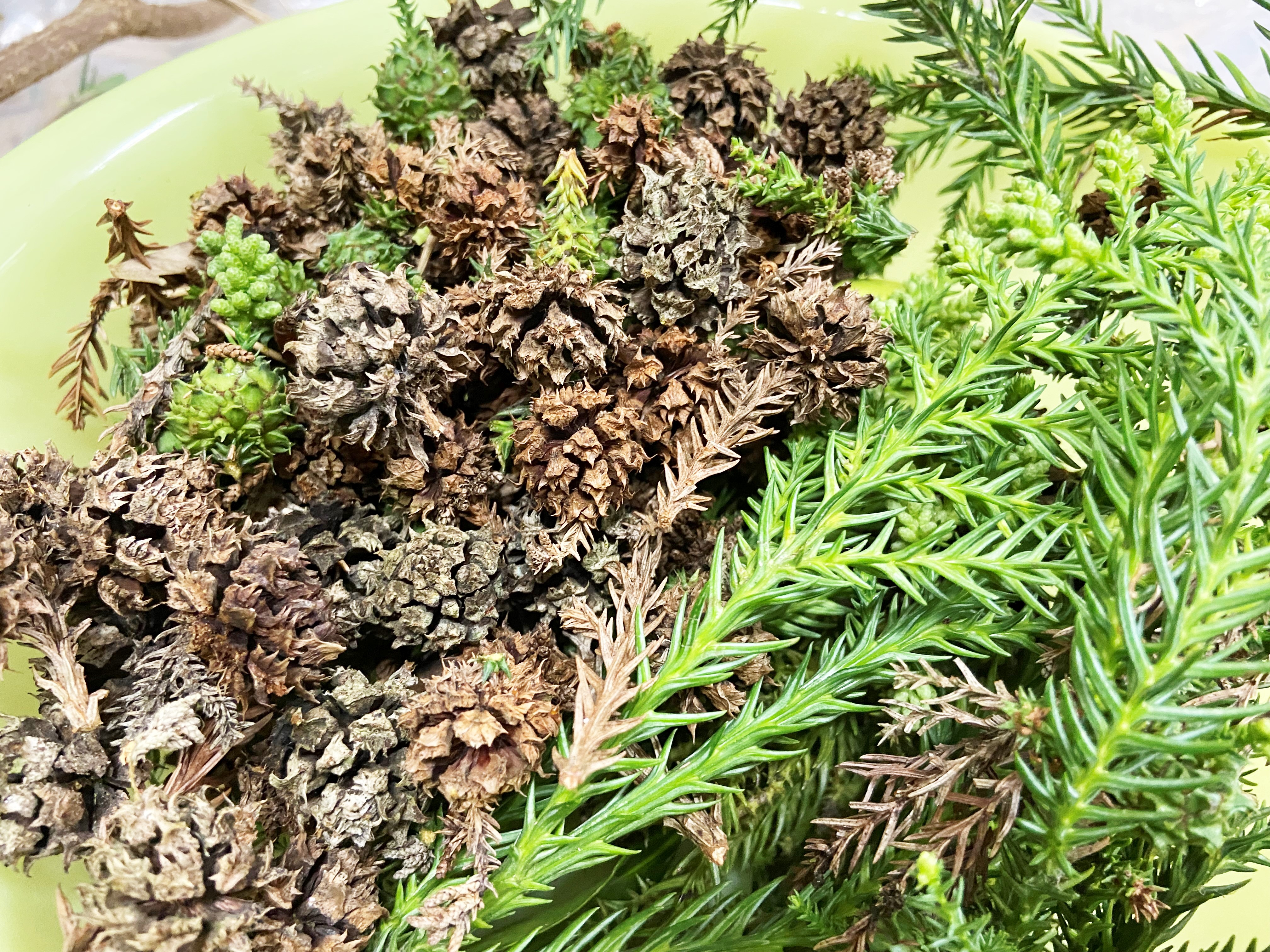 あおぞら庭園で採れたカリンやローズマリー、裏庭で採取した杉の実や松ぼっくりが使われました。