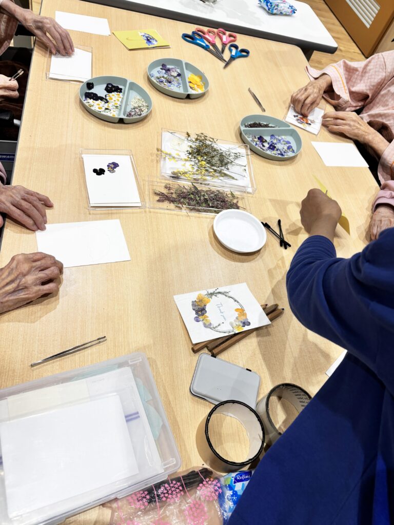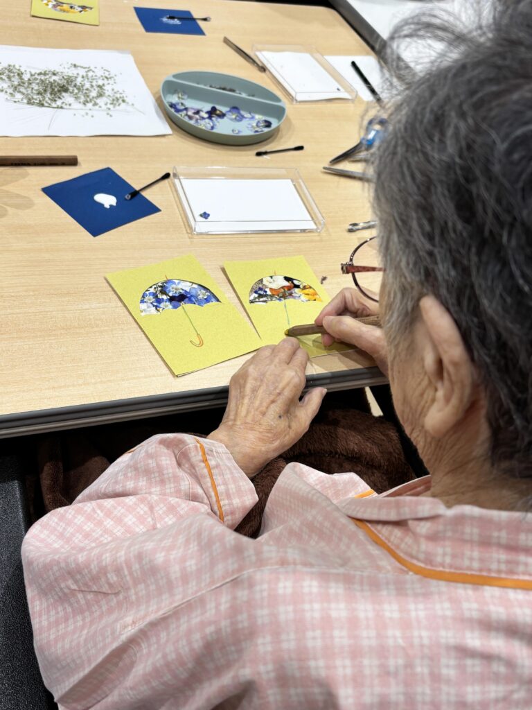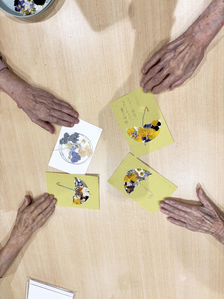 リハビリの一環として、庭で育てたパンジーを使い、押し花のカードづくりを行いました。