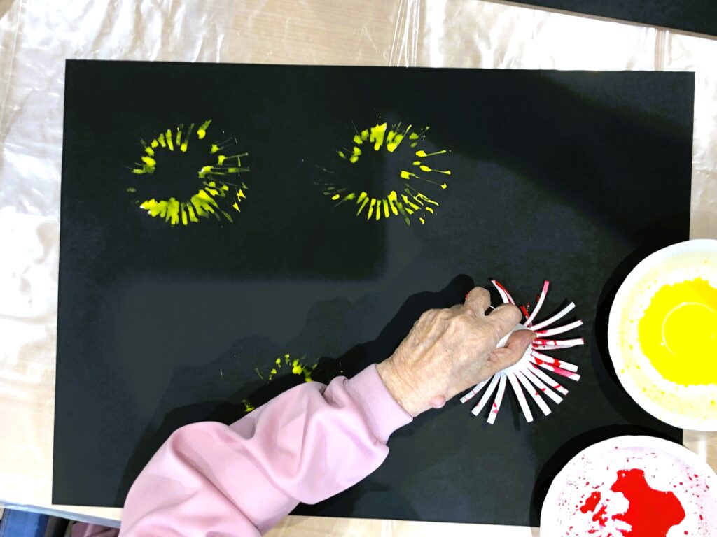 先を細かく切って絵の具をつけ、黒い画用紙にスタンプすると、まるで夜空に広がる花火のように色鮮やかな模様が浮かび上がります。