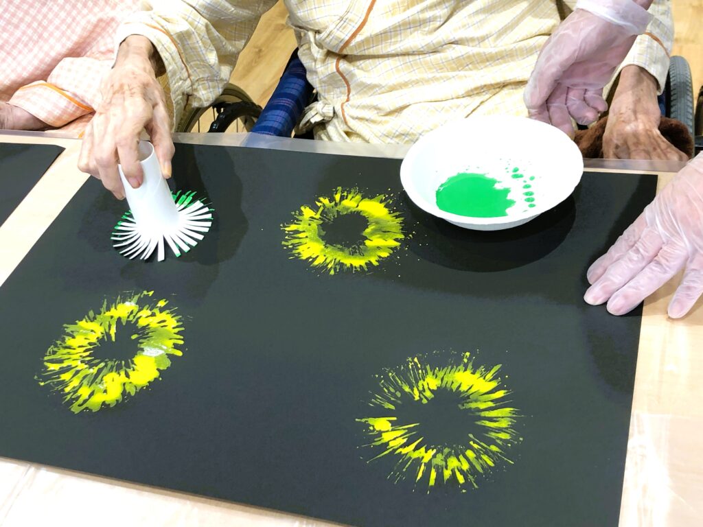 力加減によって花火の大きさや形が変わるので、自然と手に力が入り、リハビリにもつながります。少し細い芯も使っていただき、指先を動かす練習にもなりました。