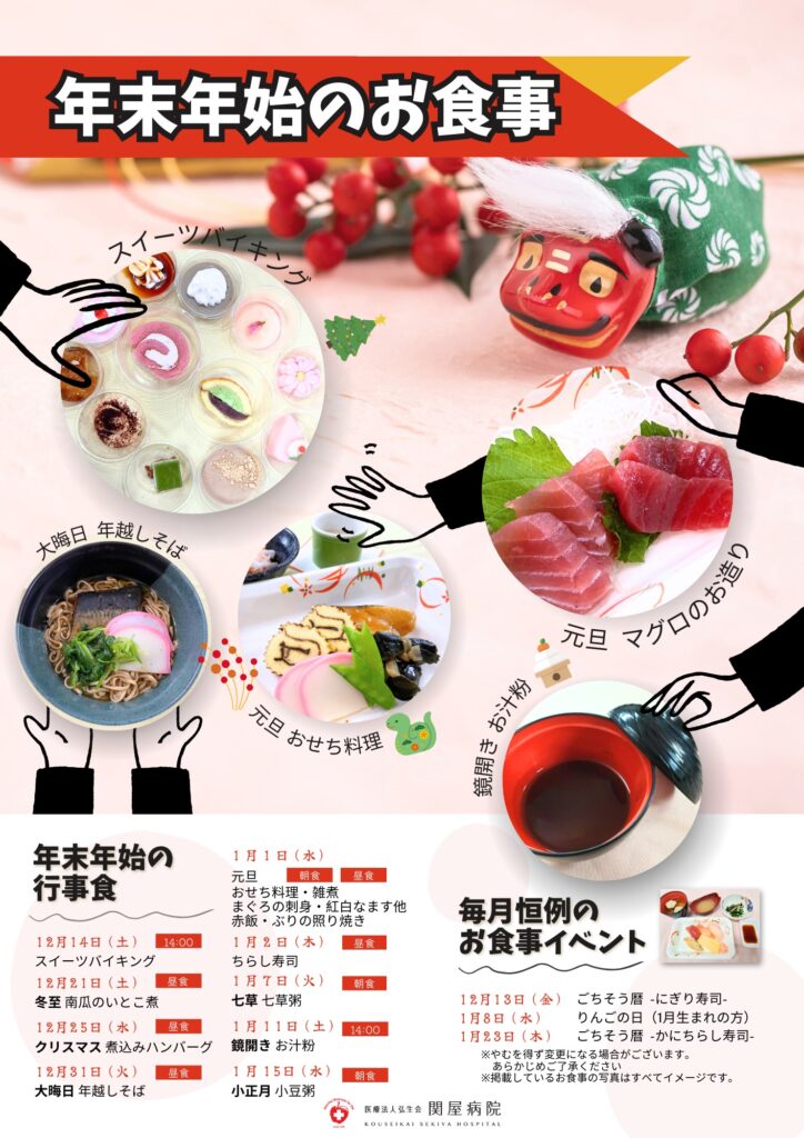 1 月 1 日(水)元旦 おせち料理・雑煮・ まぐろのお造り・紅白なます他・ 赤飯・ぶりの照り焼き