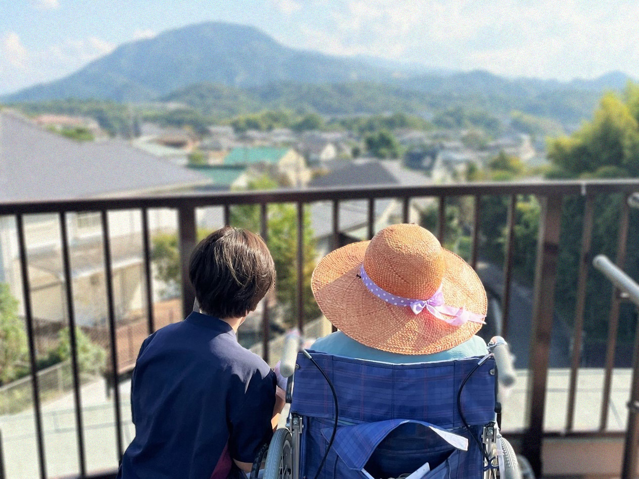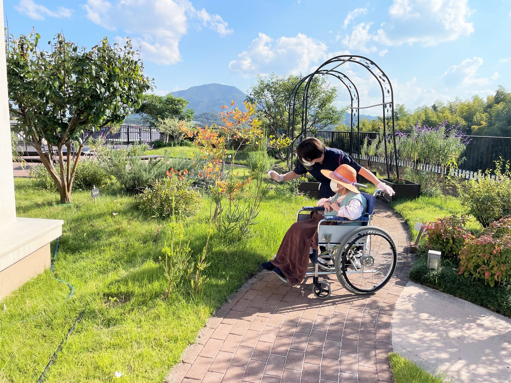 体調が回復され久しぶりに庭園に出られた患者さま。「やっぱり外はいいね」と景色や草花をご覧になられて過ごされていました。