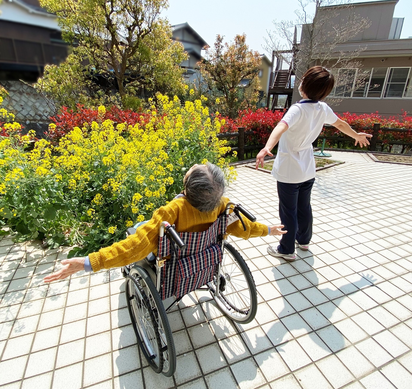 こちらは、ハナミズキガーデン(こんごう棟中庭)の光景です。患者さまは、この場所でいつも両手を広げて深呼吸されるそうで、作業療法士も一緒にやってみたところとても心地よく、それ以来、深呼吸はお二人の習慣になっているそうです。