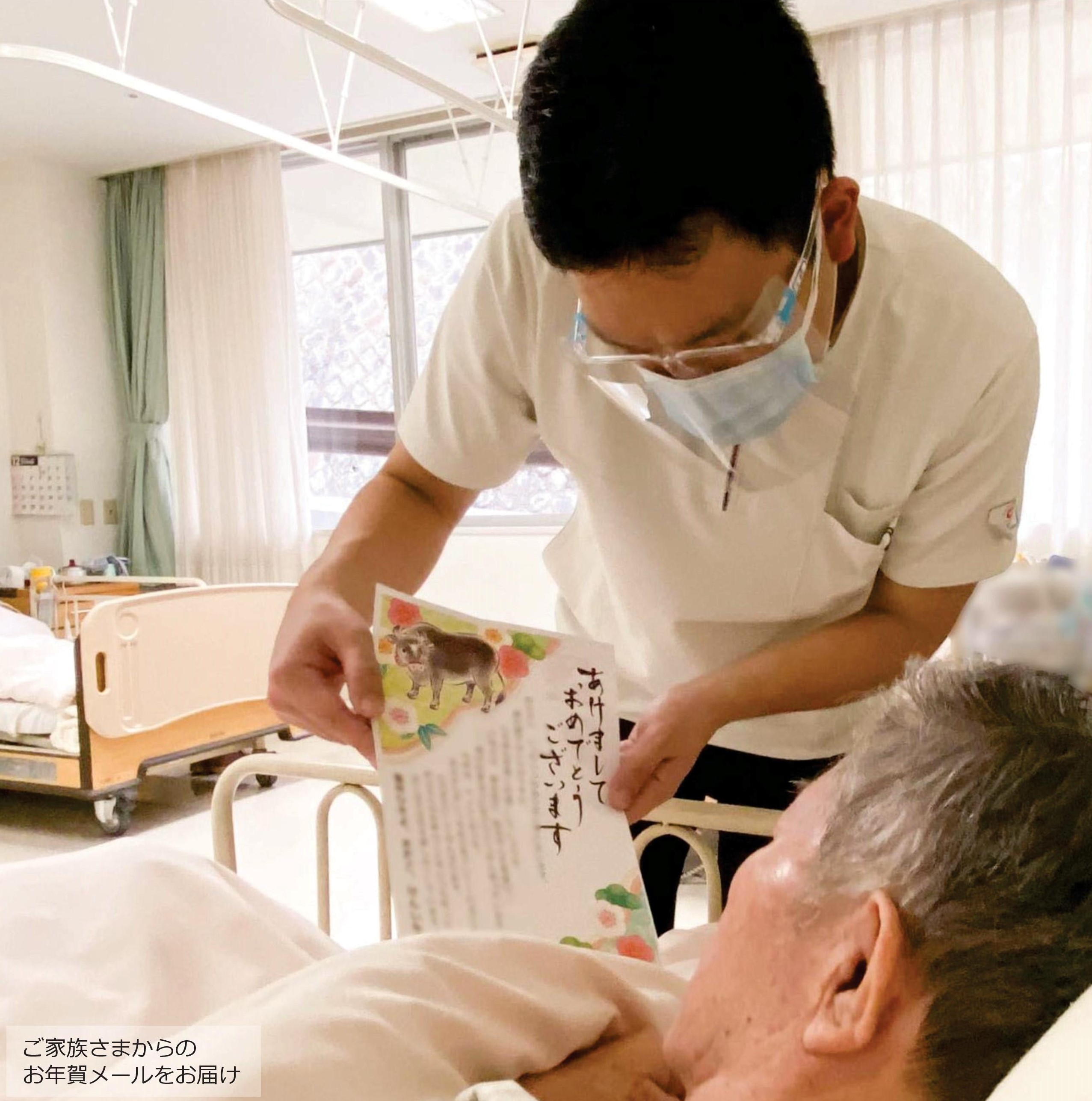 患者様にいつでも何度でも送れる「お見舞いメール」 2021.01.20 お知らせ 当院では、ホームページから患者さまに手軽にメッセージをお届けできる「お見舞いメール」を実施しております。 いつでも何度でも送れるので、開始以来多くの方にご利用いただいております。 昨年末には期間限定でメッセージを干支の便箋に印刷してお届けする「お年賀メール」を実施し、患者さまからとびきりの笑顔をいただきました。 お誕生日メールや日常の出来事メッセージなど、お気軽にご利用くださいませ。