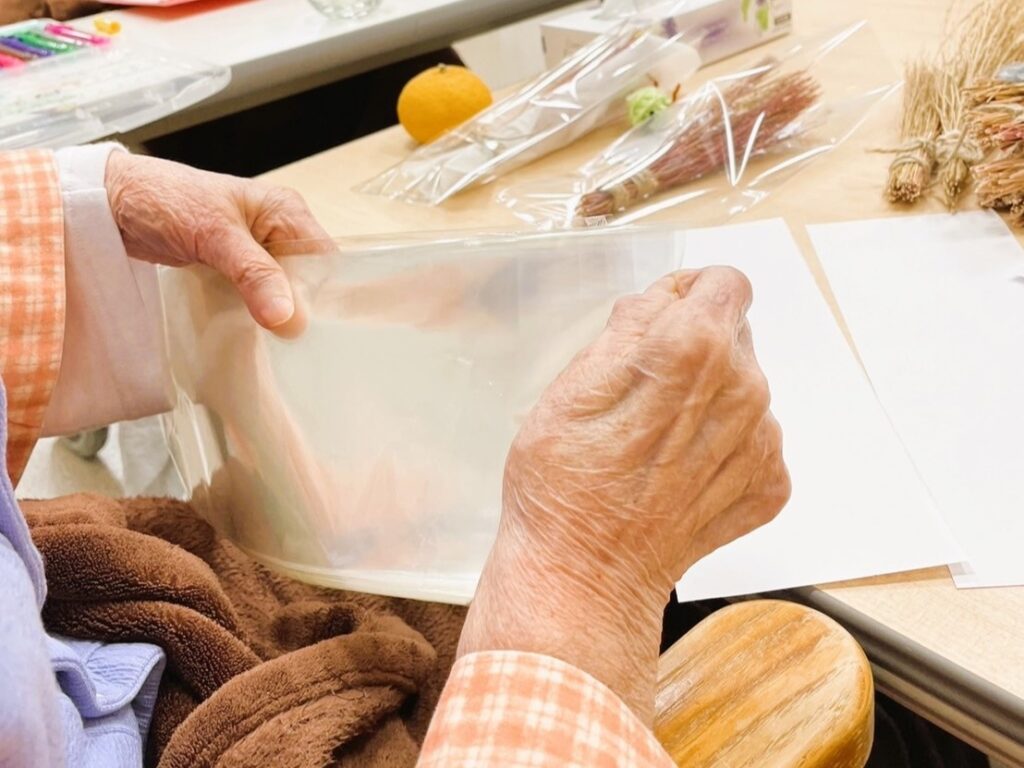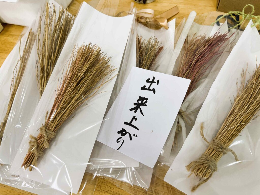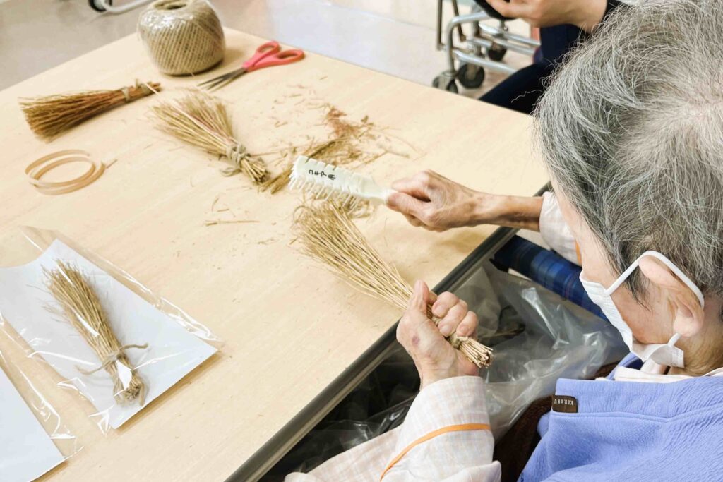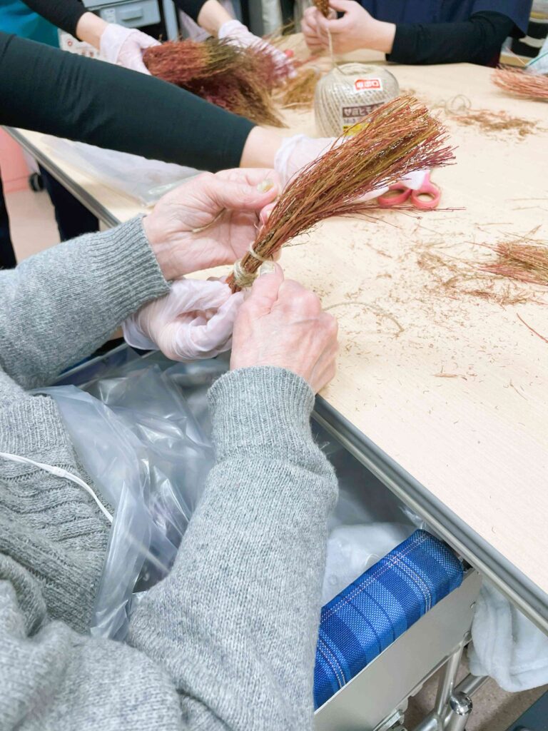 お持ち帰りくださる方を想像したり、冗談を言いながら笑い合ったりしながら患者さまがつくられた”ミニほうき”。