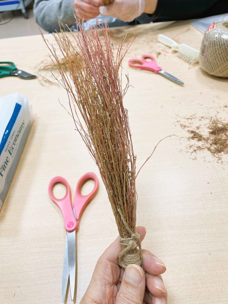 コキアの枝を束ねて、先を切りそろえてひもで縛ります。