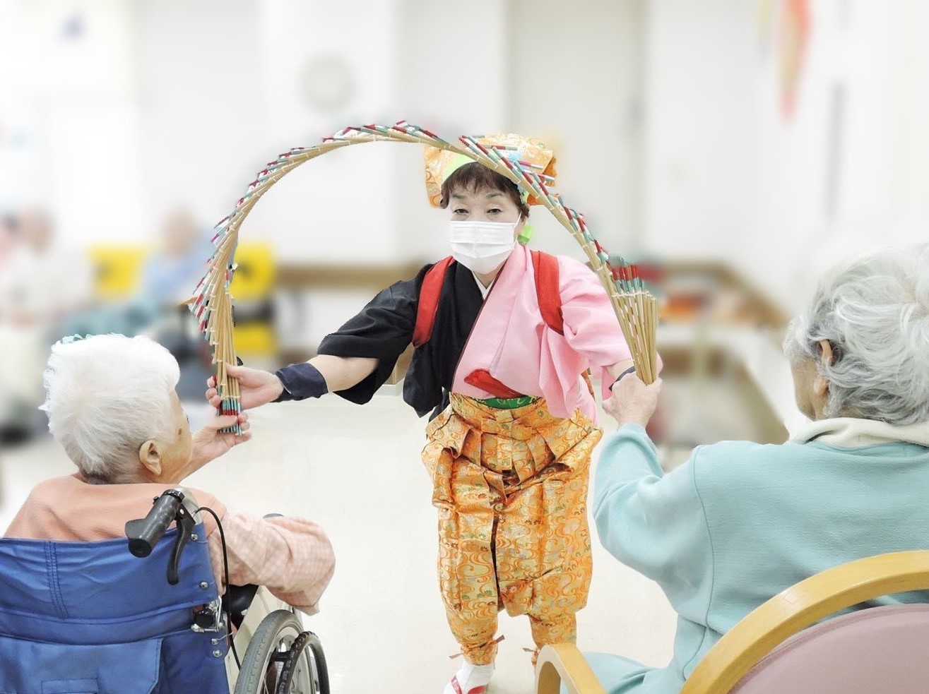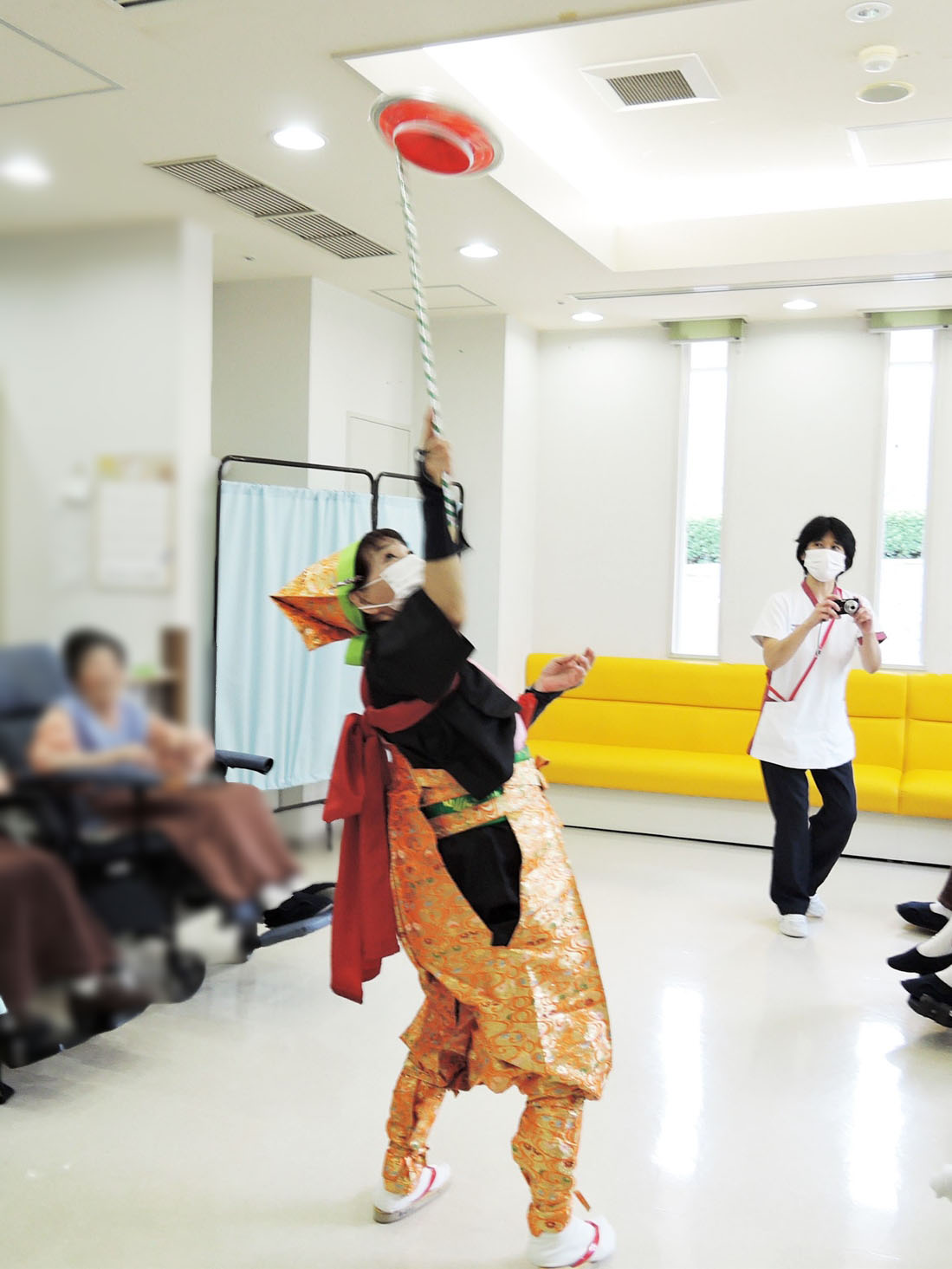 玉すだれでは「♪さてさて、さては南京玉すだれっ♪」のリズムに合わせて患者さまも一緒に手拍子をされたり