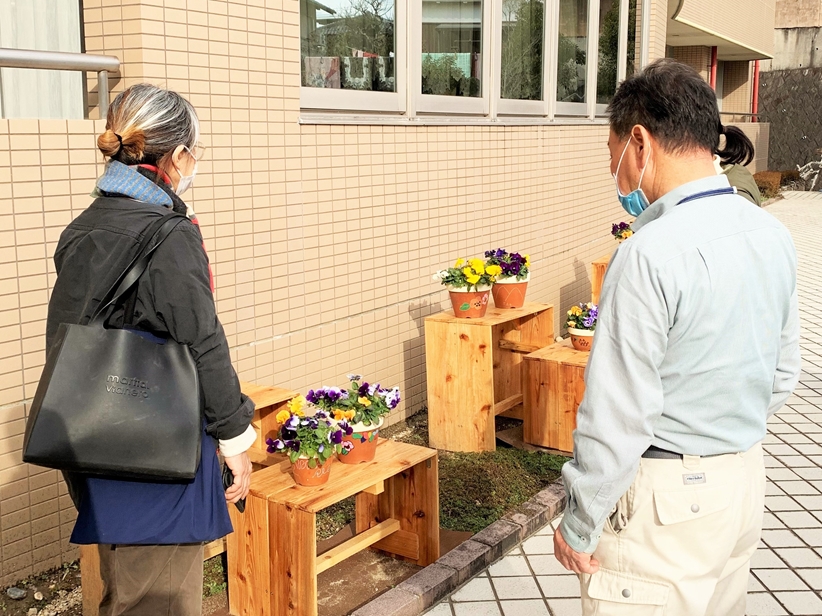 車いすの患者さまが座ったまま花の手入れができるようにと高さに気を配って作成した植木の鉢置き台もやっと使っていただけそうで、春が来るのが楽しみです。