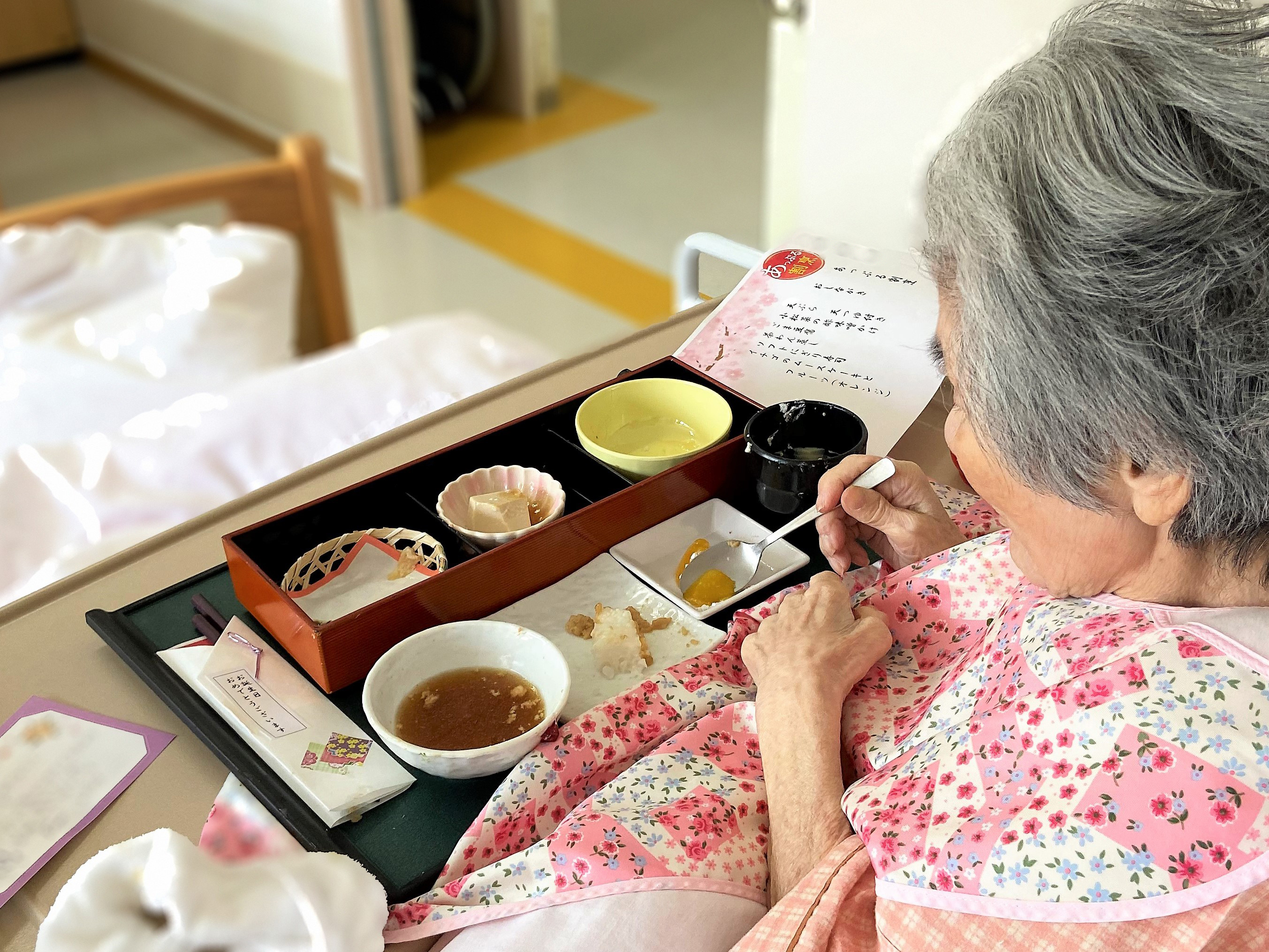 本日はあっぷる割烹の日でした。 2023.03.08 お知らせ 調理スタッフが、一つ一つ丁寧に盛り付けていきます。 ご家族さまからのお誕生日メッセージを、嬉しそうに読まれる患者さま。 「美味しい、美味しい」と何度もおっしゃって完食されました。 あっぷる割烹は、患者さまのお誕生日をお祝いする特別なお食事です。 「あっぷる割烹」については次の記事(3月10日)で詳しくご紹介します。