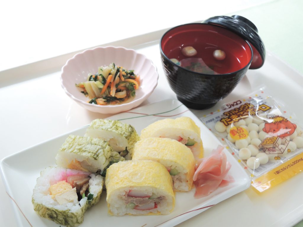 本日は節分です。 行事食のご紹介 2020.02.03 お知らせ 主食がご飯の患者さまに節分行事食をお召し上がりいただきました。 巻きずしは患者さまにお召し上がりいただきやすいように昆布と玉子で巻き、お豆の代わりにくちどけの良い玉子ボーロもご用意しました。