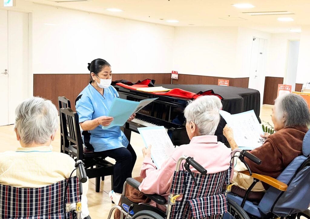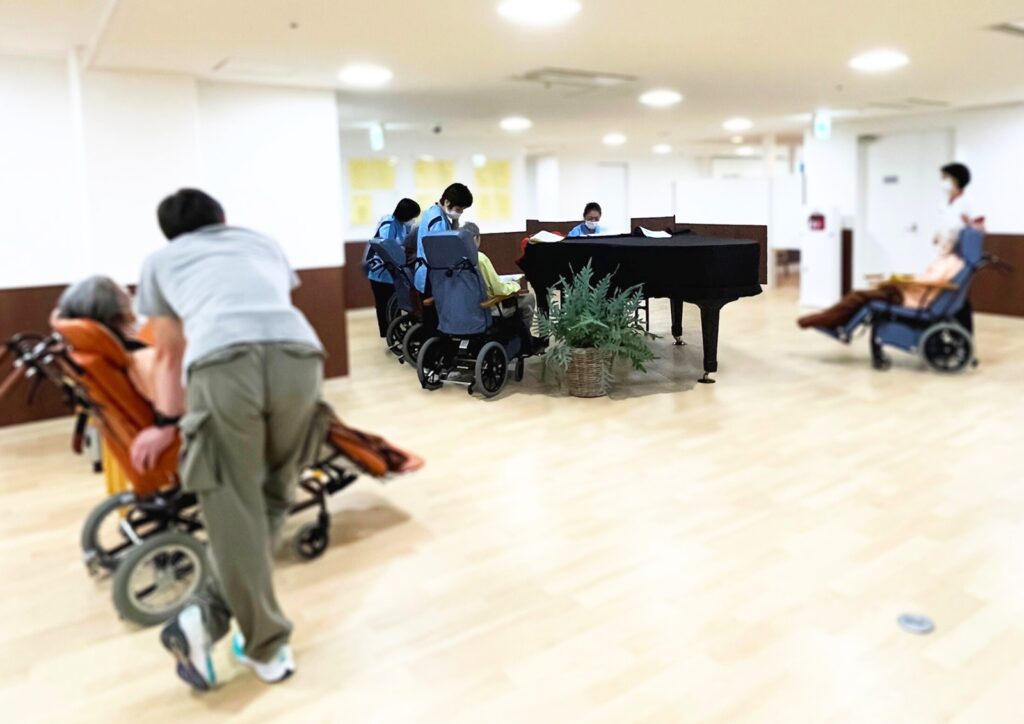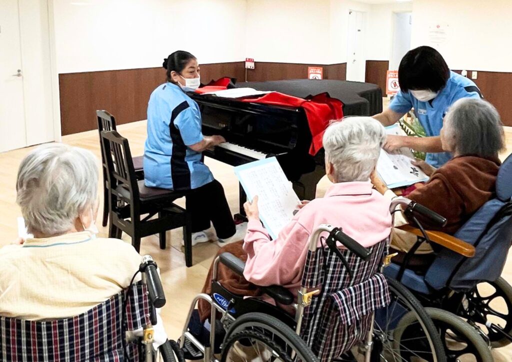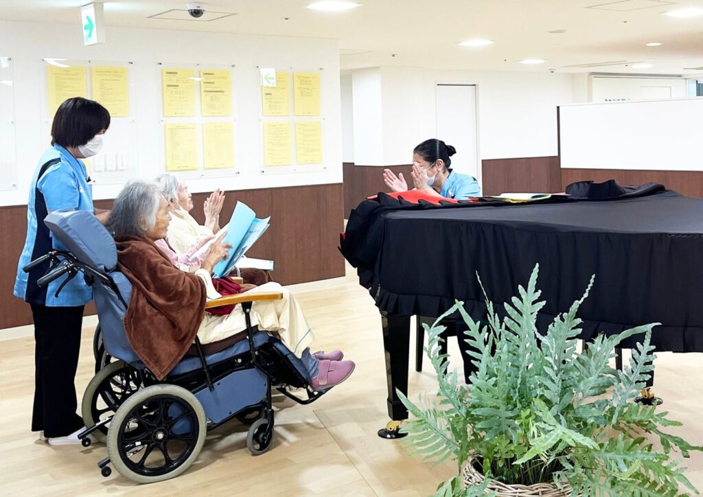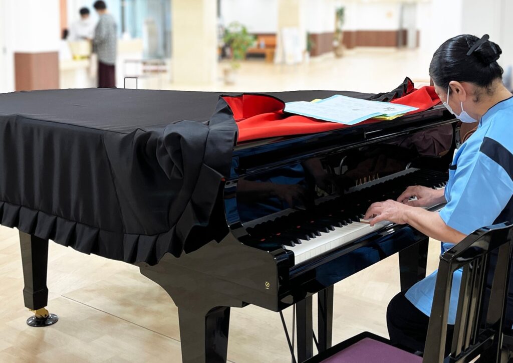 ある日のこと、患者さまから「ピアノ演奏に合わせて歌いたい」というリクエストがあり、スタッフが玄関ホールのピアノで演奏を始めました。