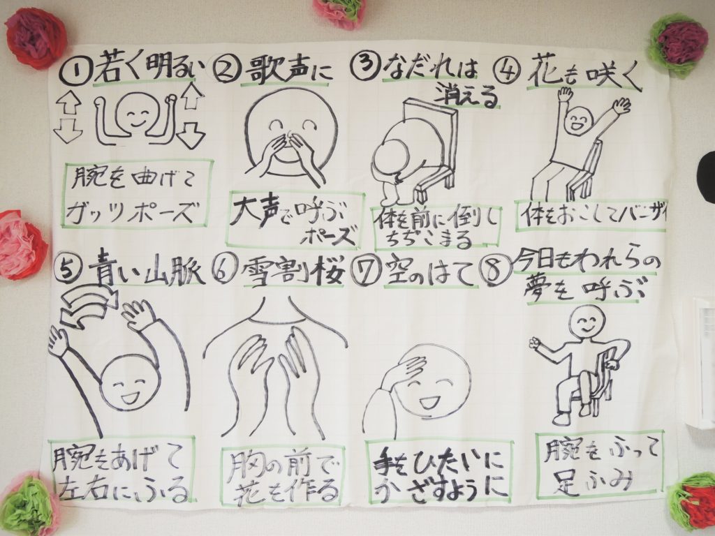 唱歌がお好きな患者さまが多いので、唱歌に合わせた体操も定期的に行っています。患者さまや病棟スタッフみんなで体操ができるようにと、スタッフが振付をイラストにしました。