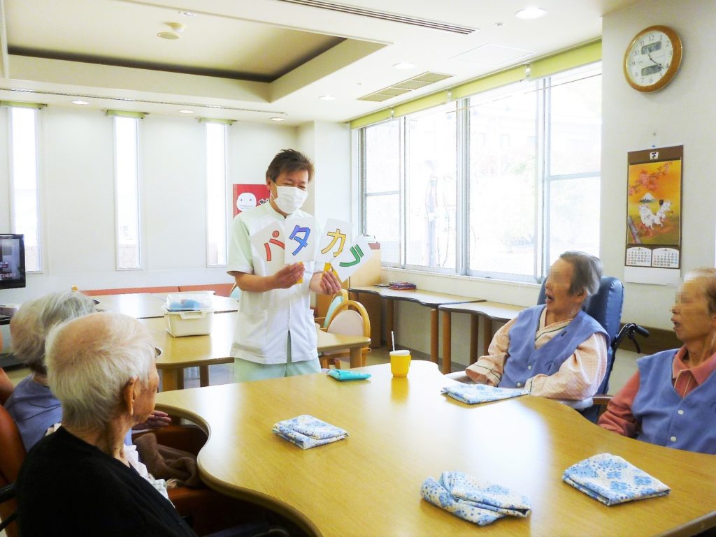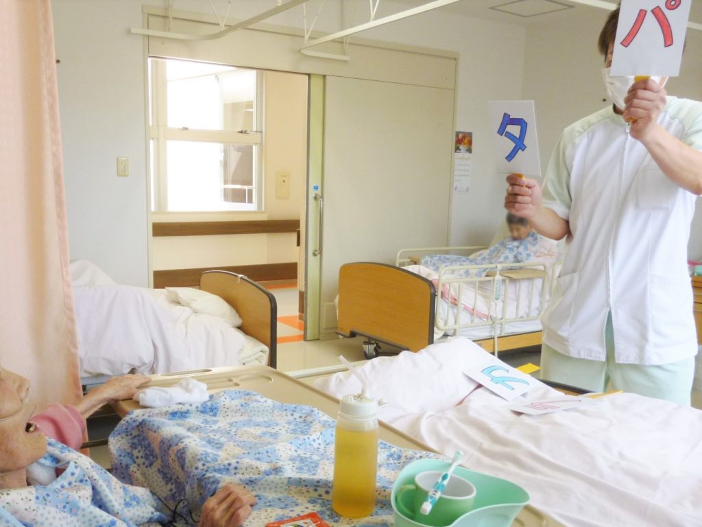 病室で「パタカラ体操」を行っていると隣の病室からも「パ」「タ」「カ」「ラ」と声が聞こえて病棟が賑やかになります。