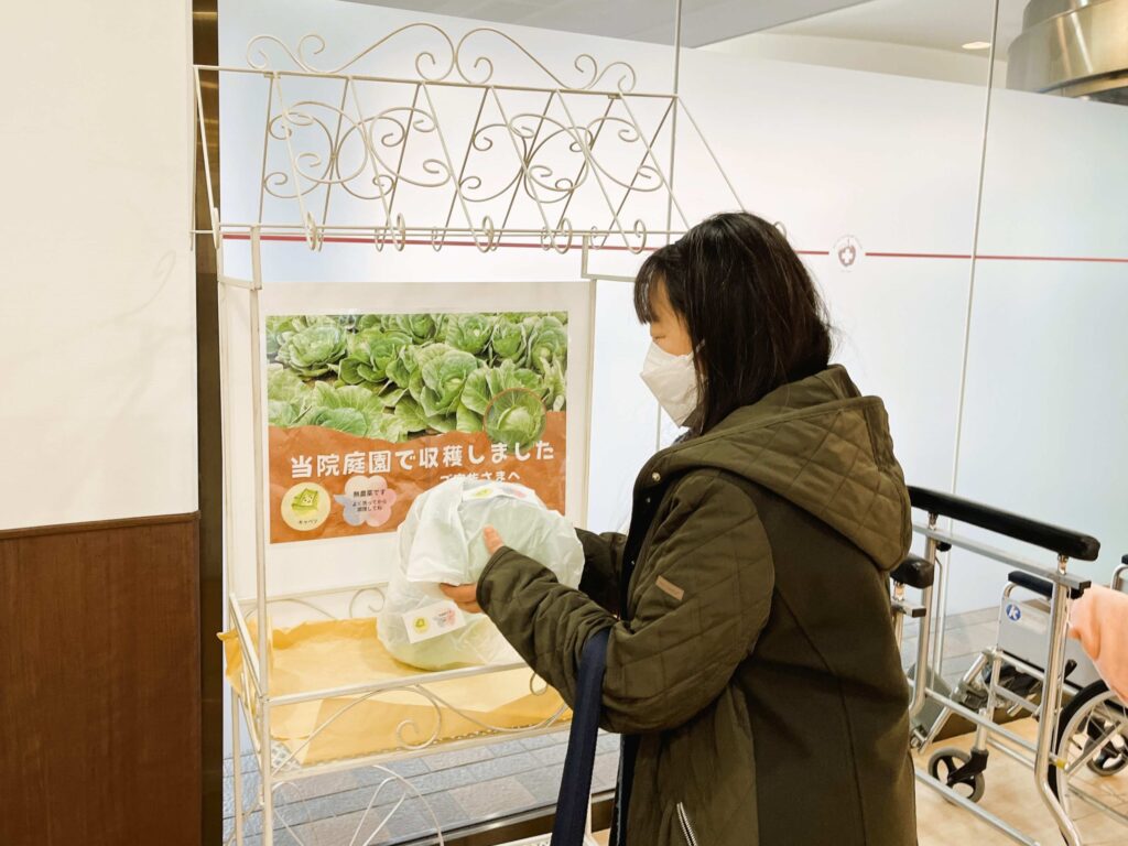 当院で収穫した野菜や花壇で摘んだ花、ドライフラワーにした飾りなど、関屋病院産のものをリハビリの一環で患者さまが手入れをし、梱包し、白ワゴンに陳列しています。