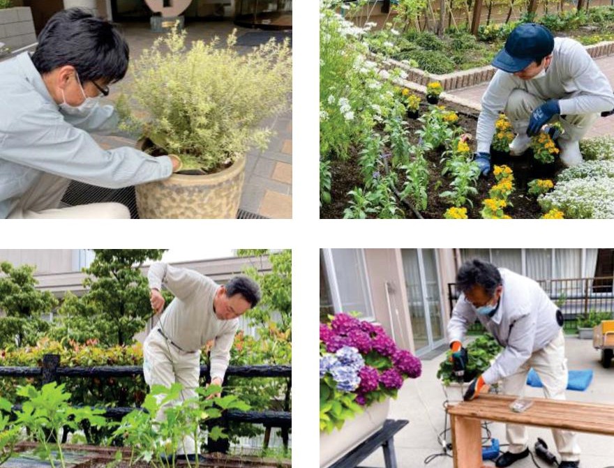この係の仕事は、草花や野菜のお手入れや植え替え、水やり、庭園の整備、病院周辺の溝掃除、時にはプランターのカバーを手作りすることも。