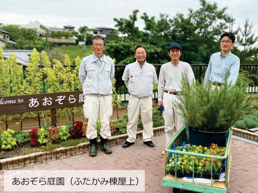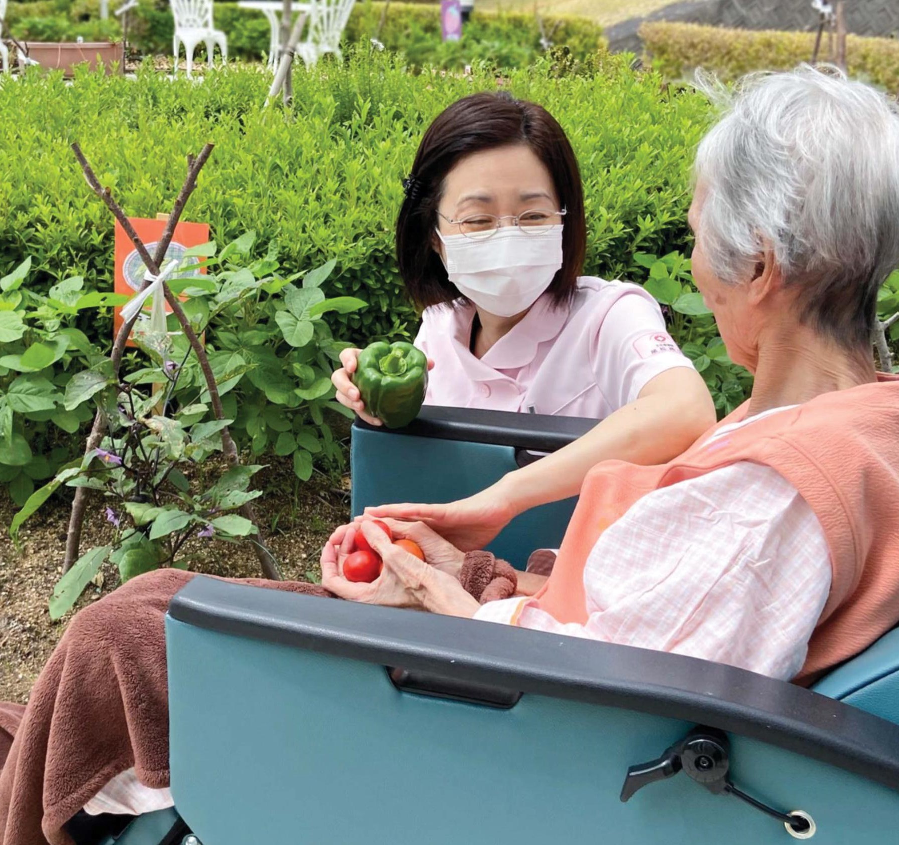 患者さまはあおぞら庭園にお散歩に行かれたり、畑の水やりや収穫をされたり、リハビリの場所として利用されたりしています。
