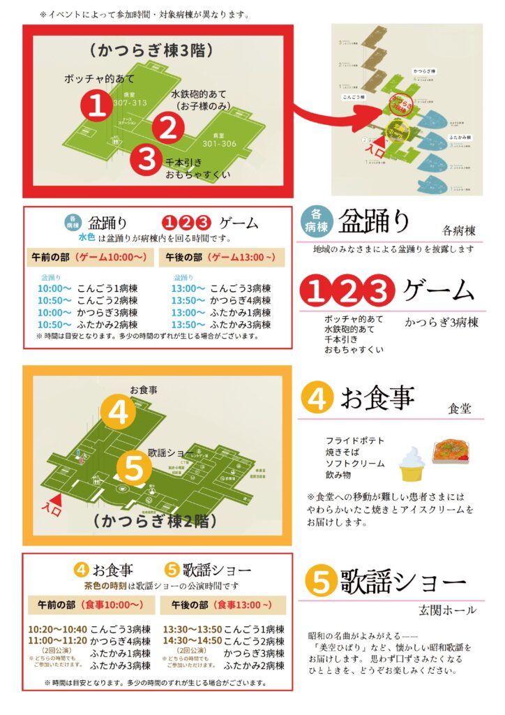 ※先日公開いたしました「夏まつりのしおり」につきまして、お食事(午前の部)の時間に誤りがございました。ご確認いただいていた皆さまにはご迷惑をおかけし、深くお詫び申し上げます。以下のとおり訂正いたします。