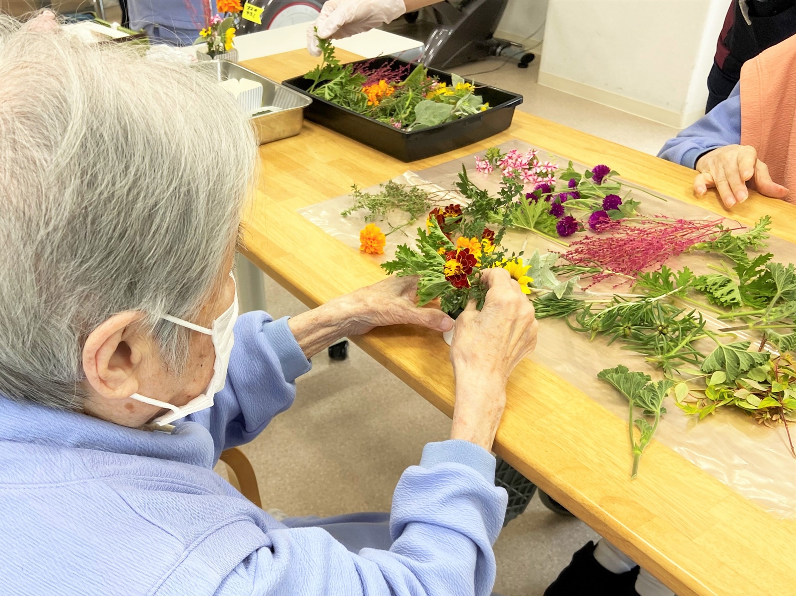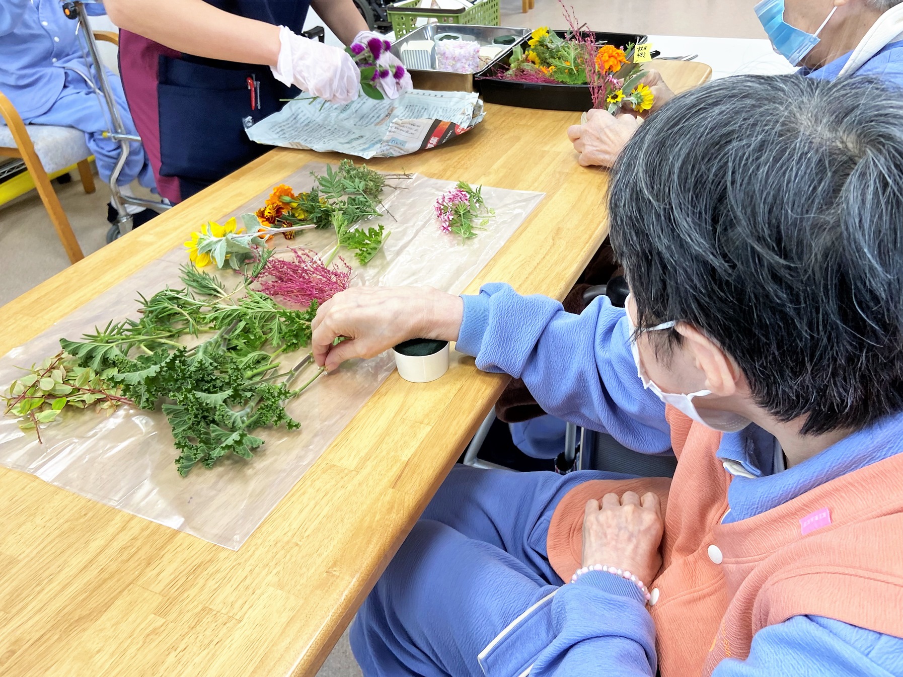 フラワーアレンジメントは、リハビリ室や病室のベッドサイドで数日にかけてたくさんの患者さまに参加していただけました。