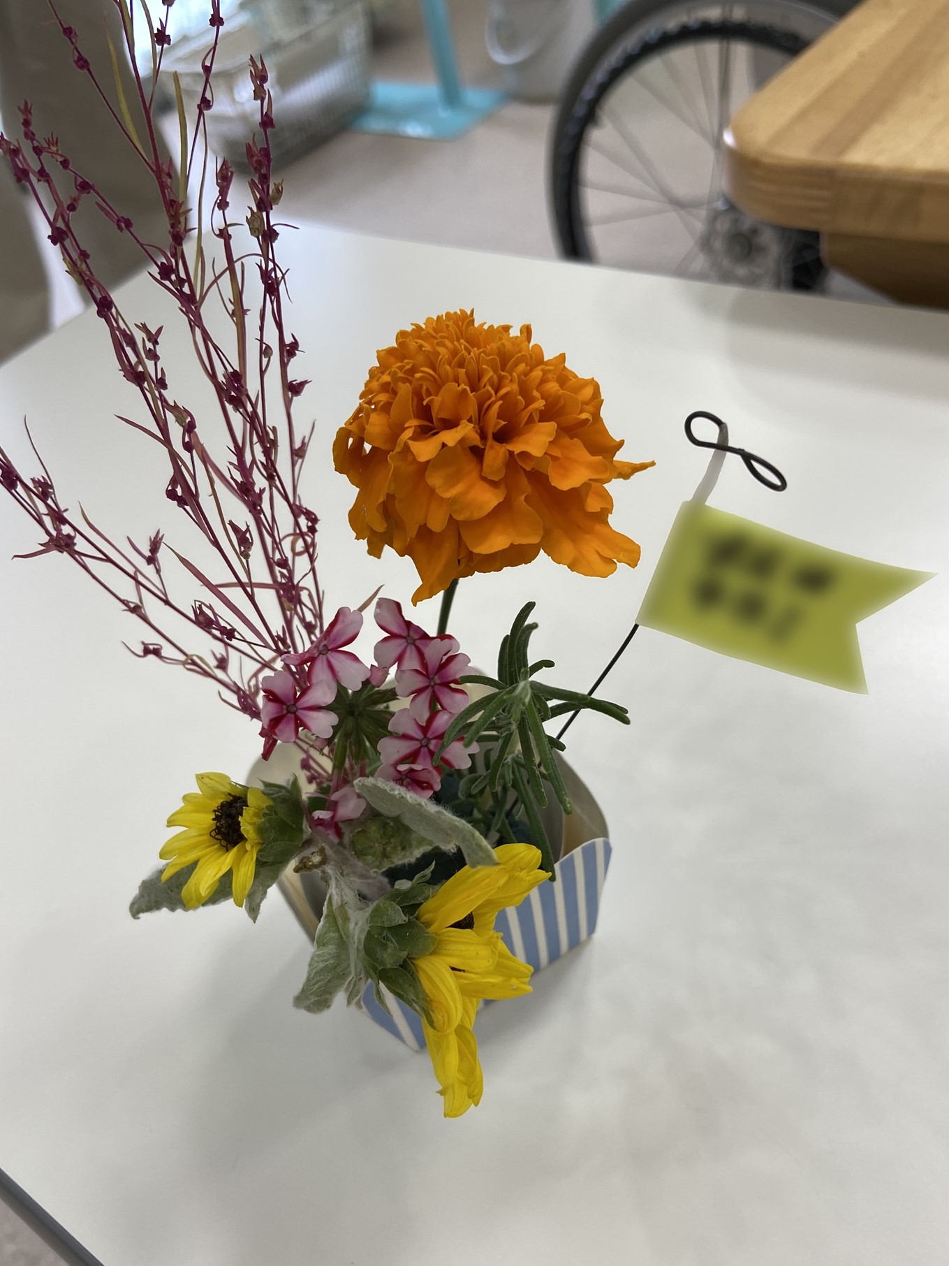 リハビリ室でフラワーアレンジメントを行うため、庭園に咲いている花を摘んできました。