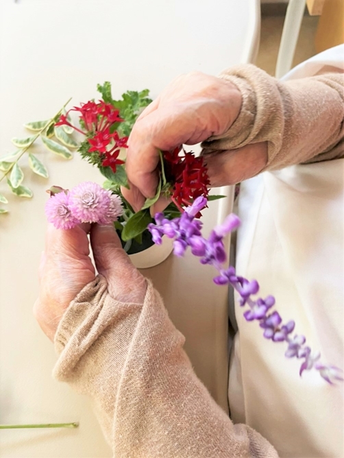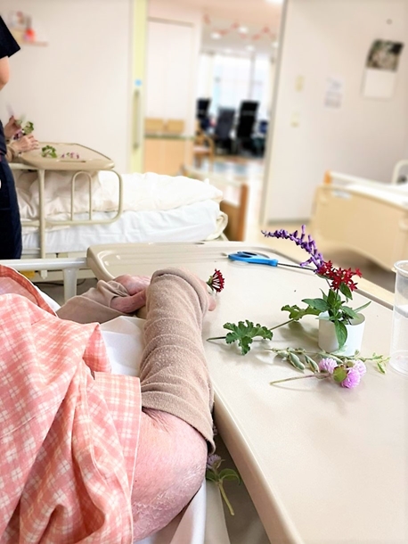 日頃は手が痛く、“何もしたくない”とおっしゃっていた患者さまには、ベッドサイドに花をお持ちしました。