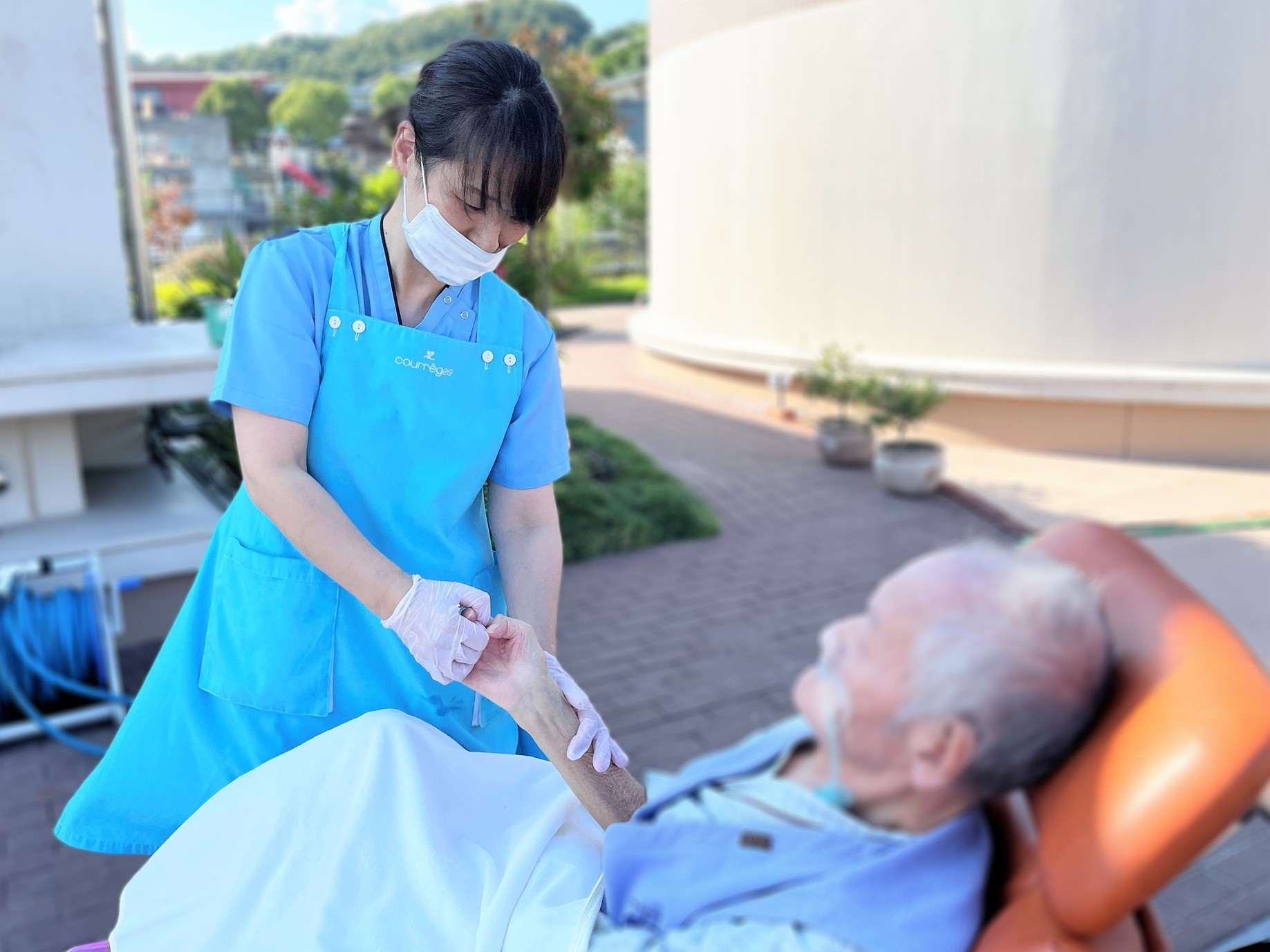 あおぞら庭園でのガーデンアロマハンドケアはラベンダーの香りのクリームを使い、その日の天候と患者さまの状態に合わせて行いました。
