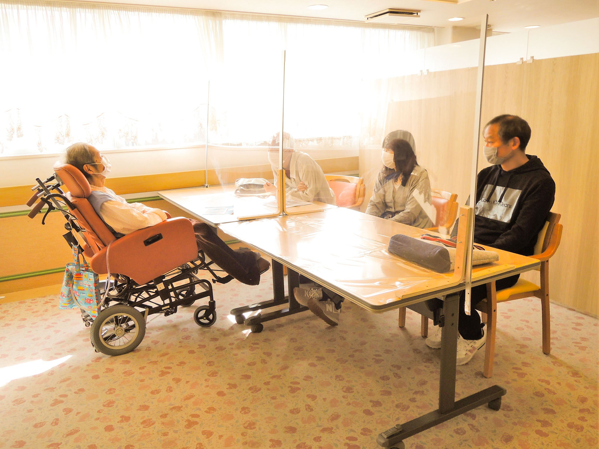 院内面会にはこんな使い方も ~院内面会Plus(プラス)~ 2021.11.09 お知らせ 《 対面とリモートの両方で 院内面会Plus(プラス)》 院内面会の際にお手持ちのスマホやタブレットで他の方を呼び出していただければ、その方も画面越しに面会していただくことができます。 院内面会にお越しいただく人数は感染対策のため3名までとさせていただいていますが、もっとたくさんで会いたい方や、遠方の家族も加えたい方はお試しください。