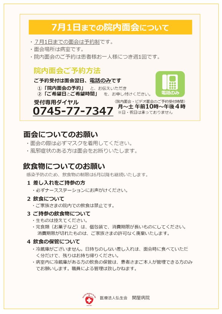 なお、すでに院内面会をご予約されている方は、変更をお受けいたしますので、ご予約専用ダイヤル(0745-77-7347)までご連絡ください。