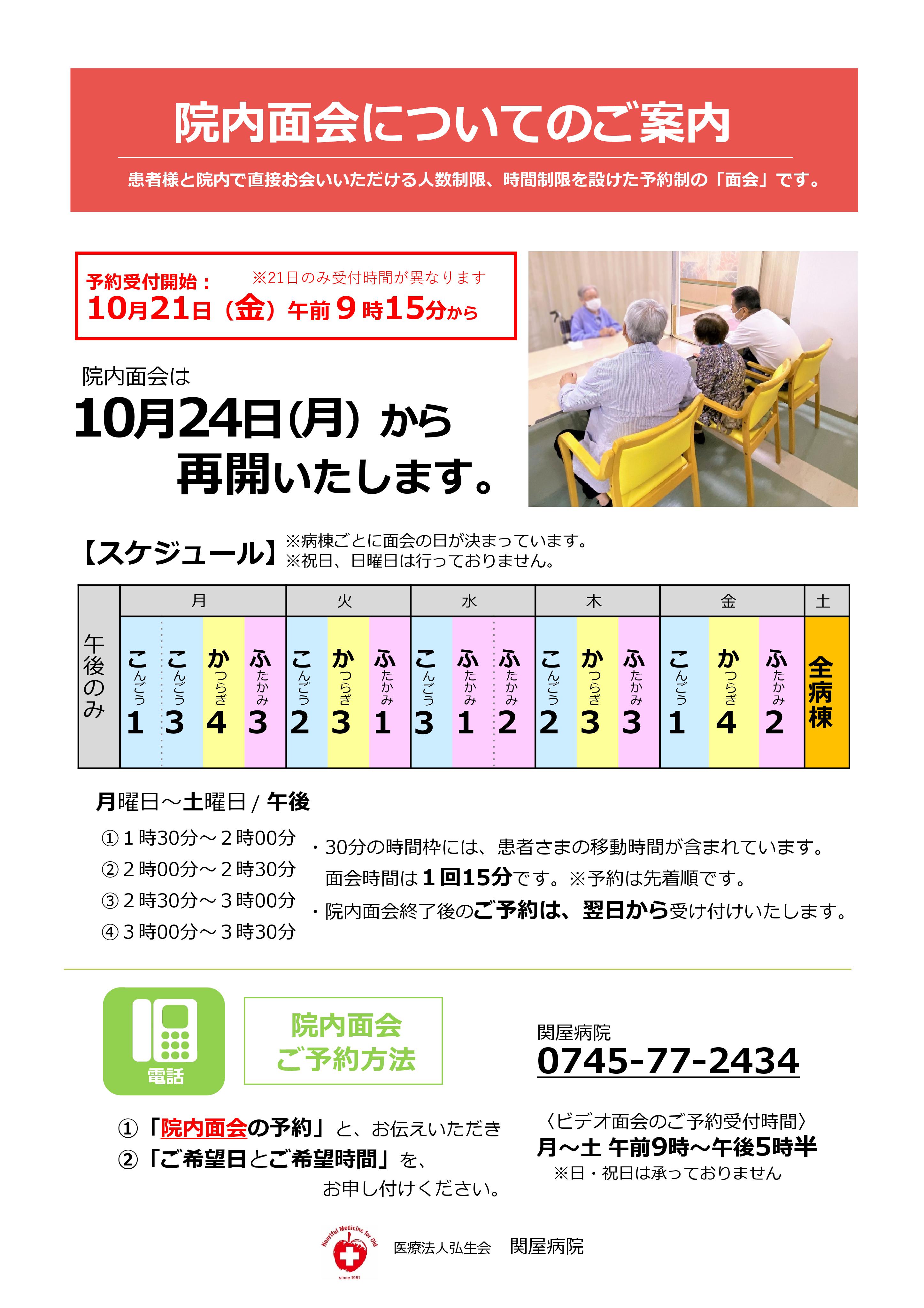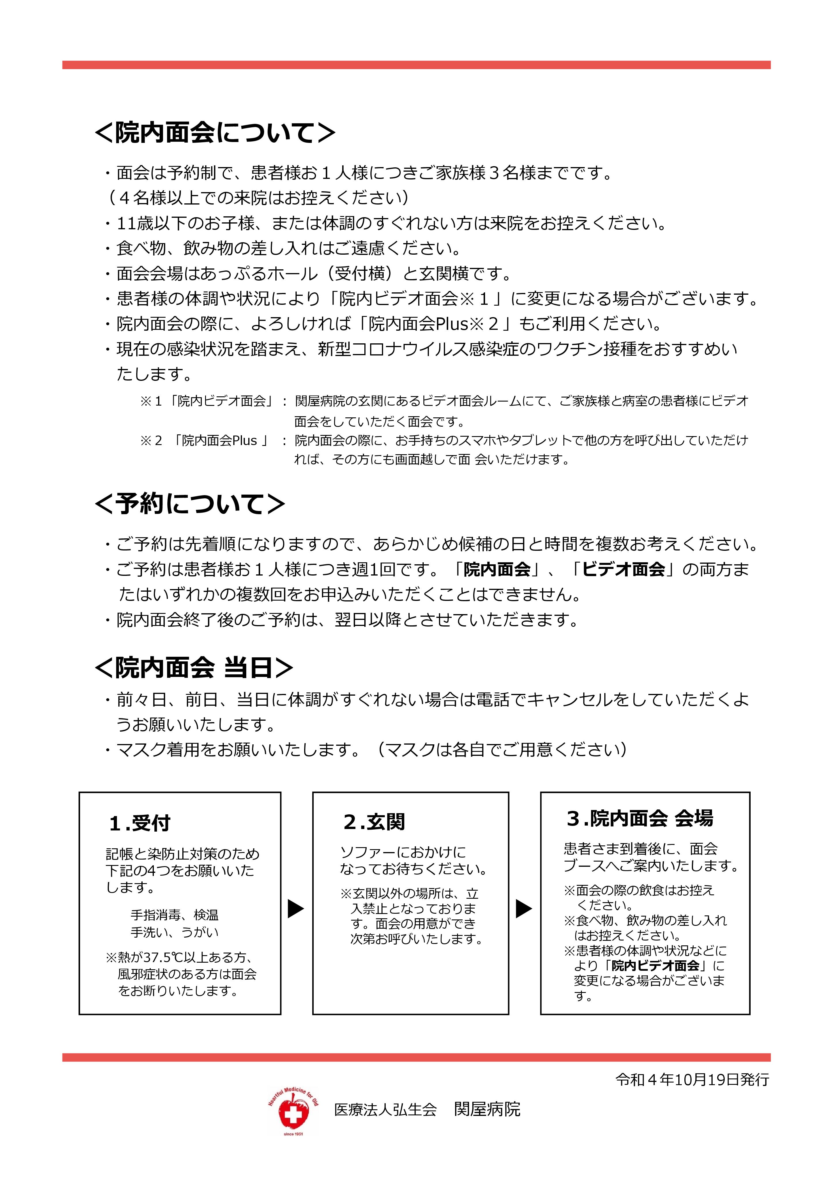 なお、感染状況を見ながらの再開となりますので、状況によっては、院内面会を中止させていただく場合がございます。その際には、こちらのホームページでご連絡いたします。