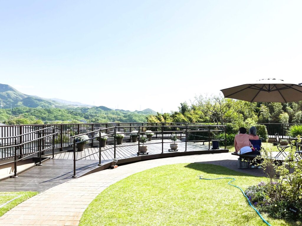 ウッドデッキで、眺望を楽しんだり、ベンチに腰掛けて心地よい風を感じながら青空の下でのんびりと過ごすことができます。
