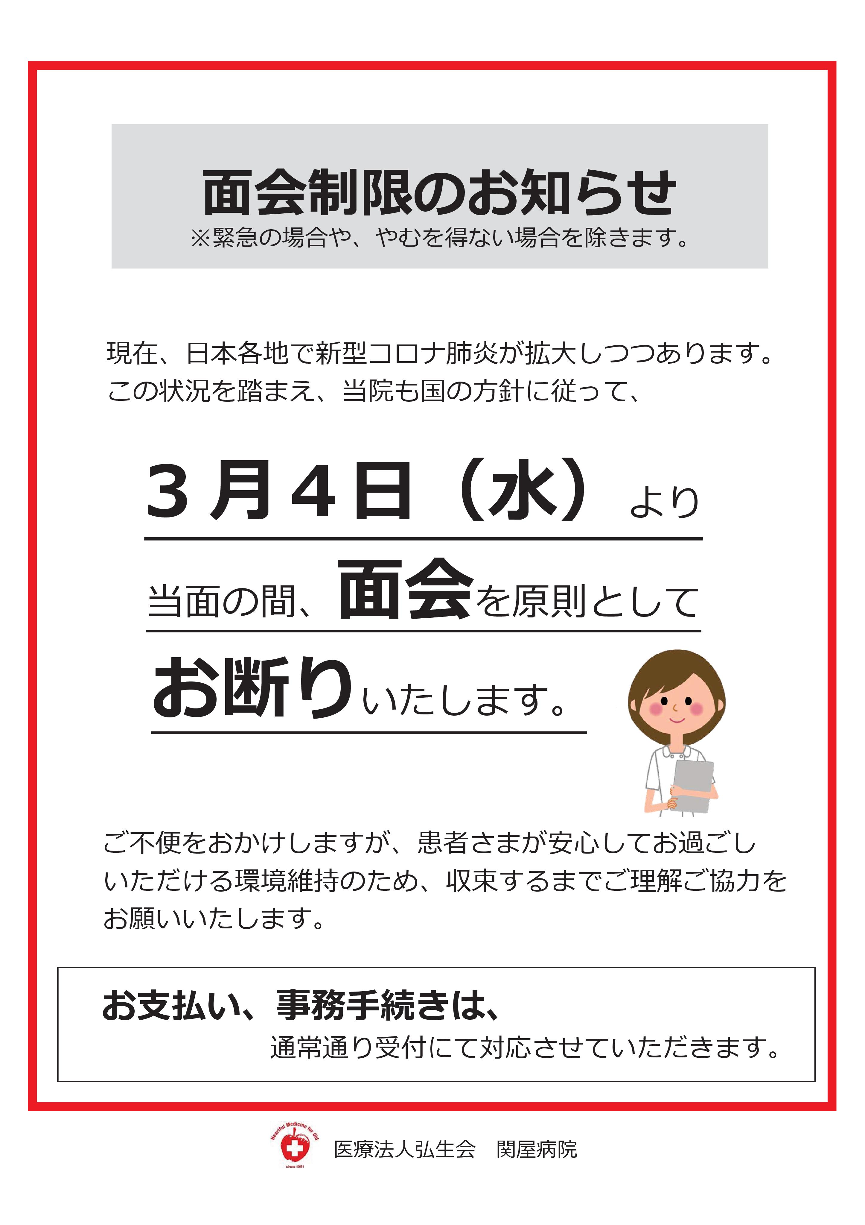 この状況を踏まえ当院も国の方針に従って、緊急の場合や、やむを得ない場合を除き、面会を原則としてお断りいたします。