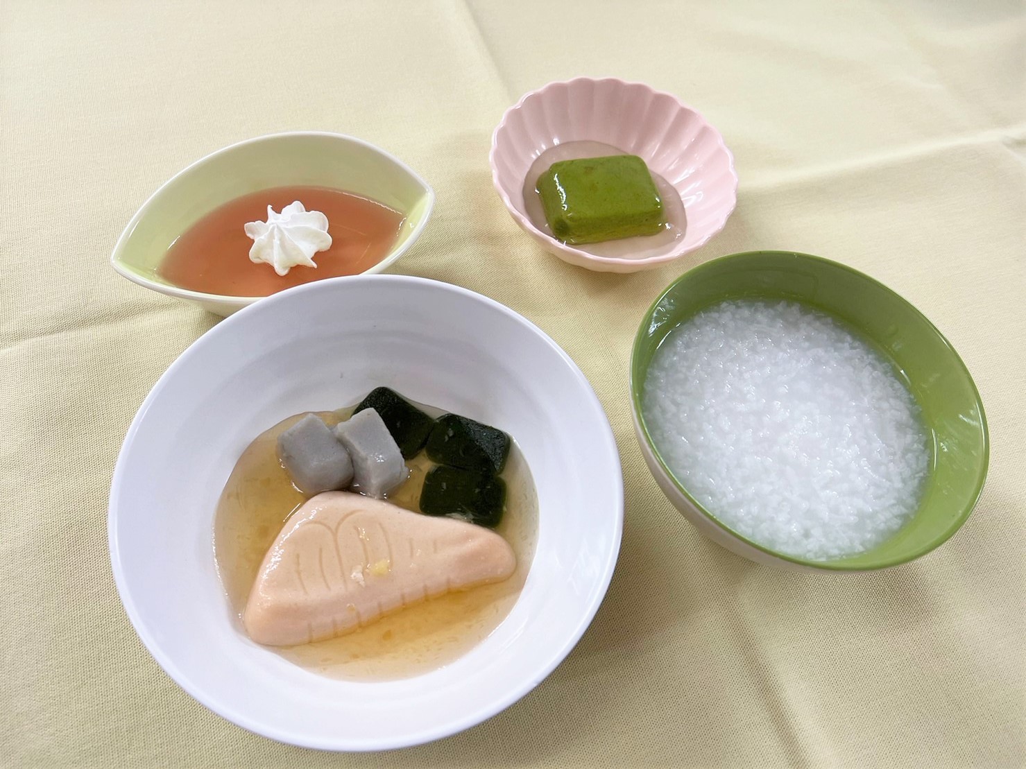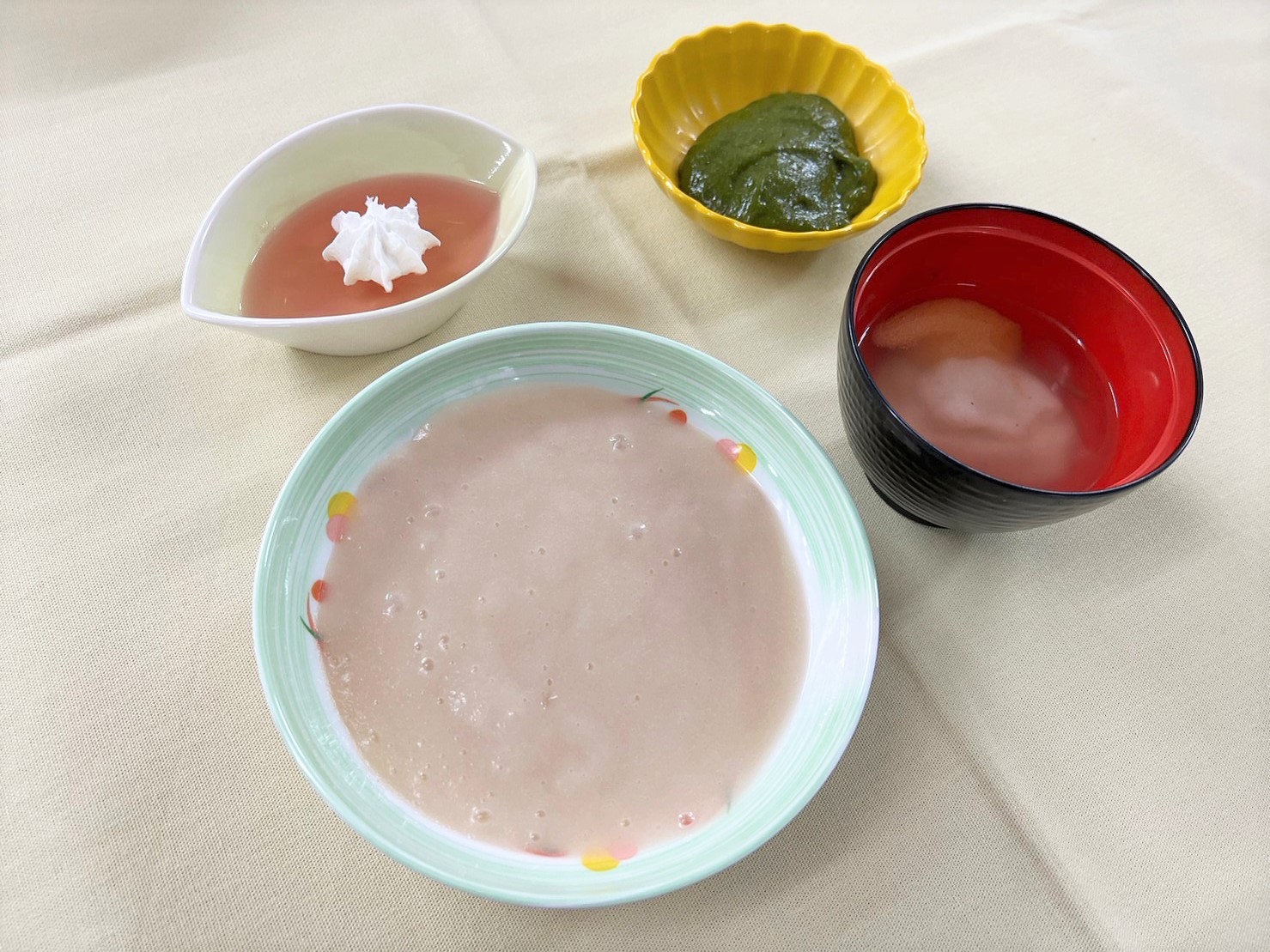これは主に咀嚼(噛む)機能や嚥下(飲み込む)機能が低下した方が食べやすいように、それぞれの食事をミキサーにかけてペースト状にしたものです。