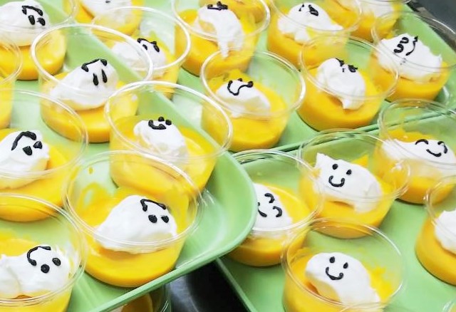 午後のおやつは生クリームにチョコでペイントしたオバケ付き「かぼちゃプリン」でした。