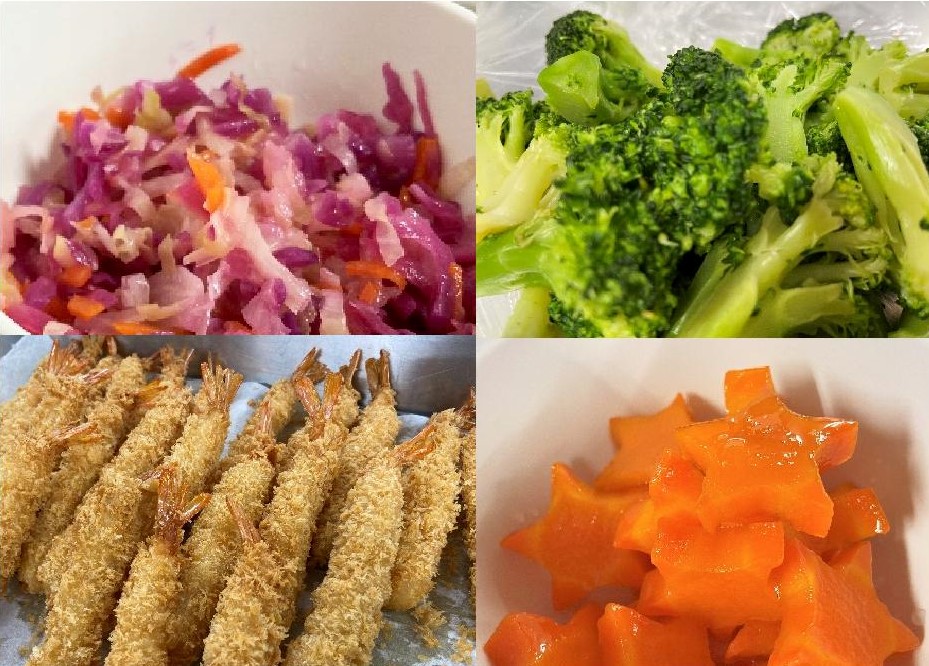 メニューは、チキンライス、エビフライ、紫キャベツのサラダ、かぼちゃスープです。