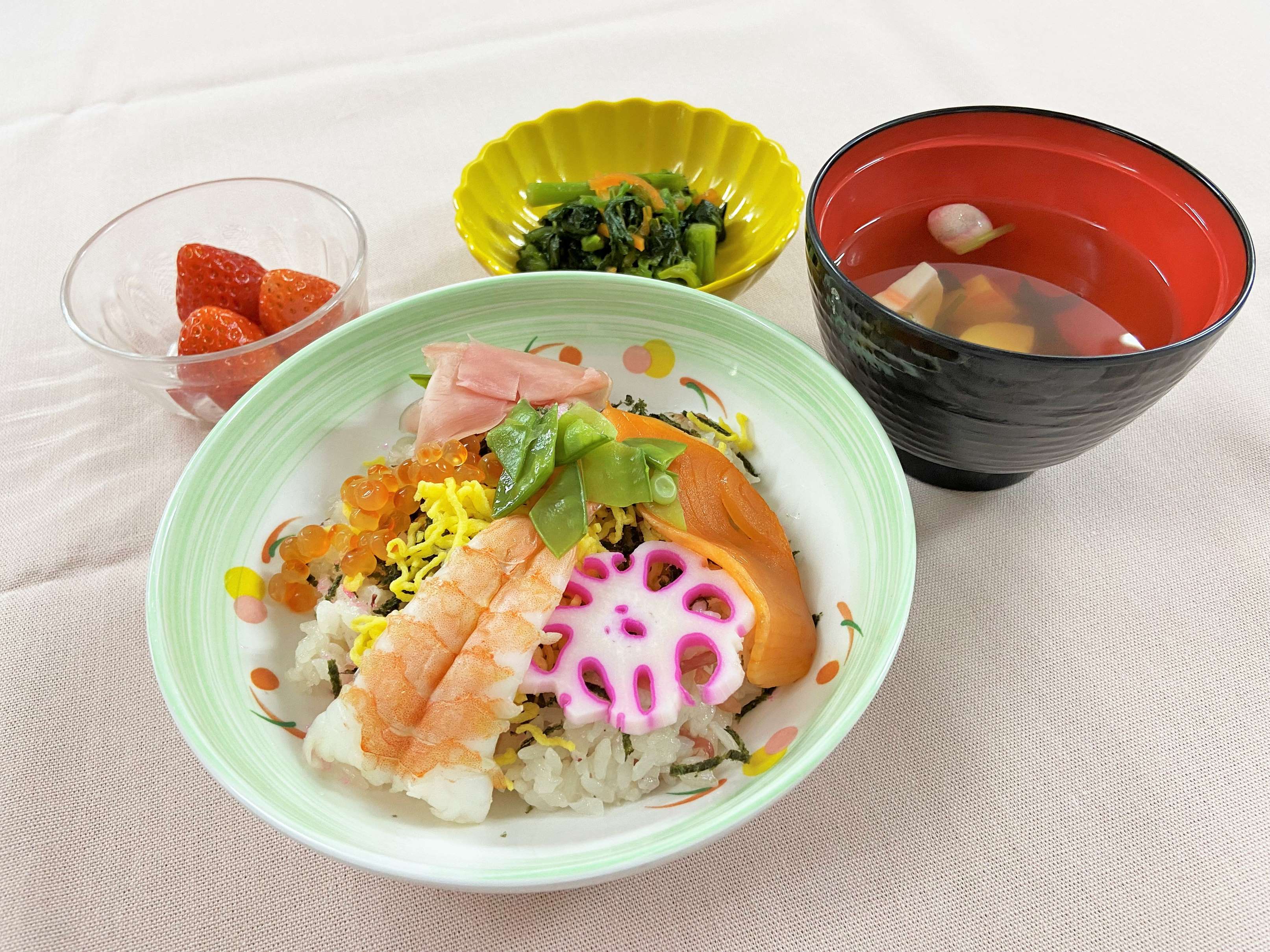 ひな桜ちらし寿司・菜の花のお浸し・すまし汁・いちご