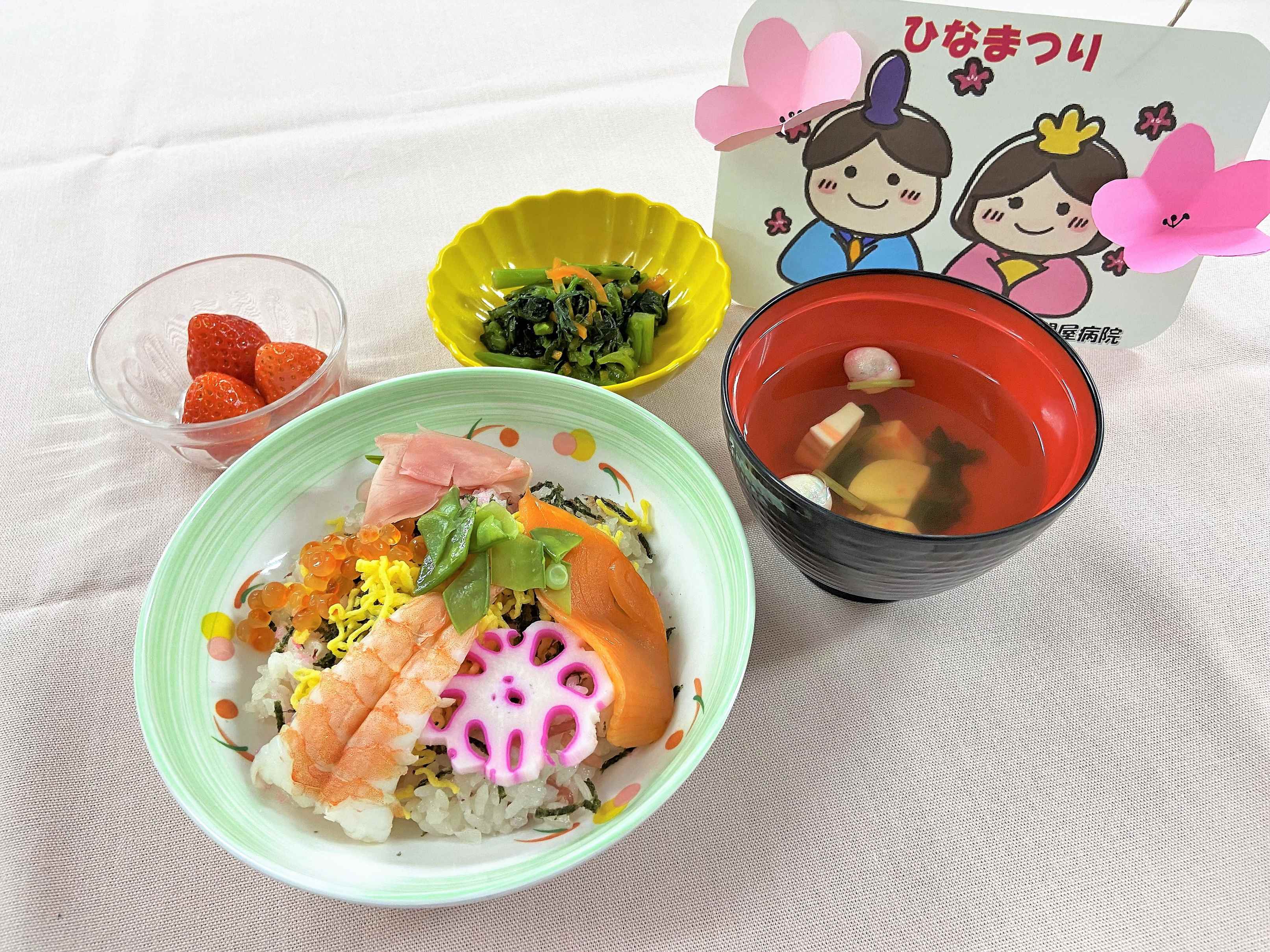 ひな桜ちらし寿司・菜の花のお浸し・すまし汁・三色花ゼリー