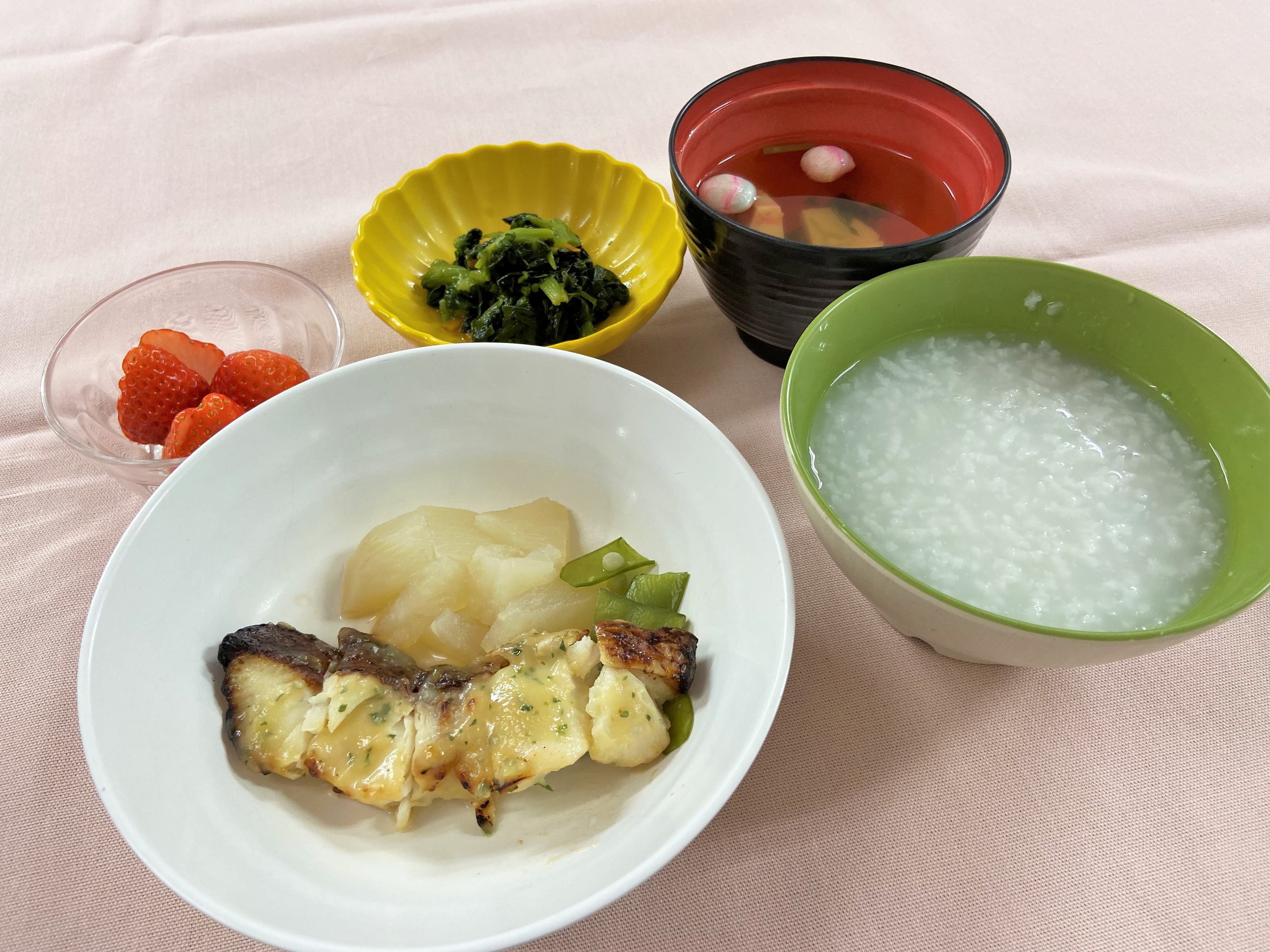 全粥・鯛の木の芽みそ焼き・菜の花のお浸し・すまし汁・いちご