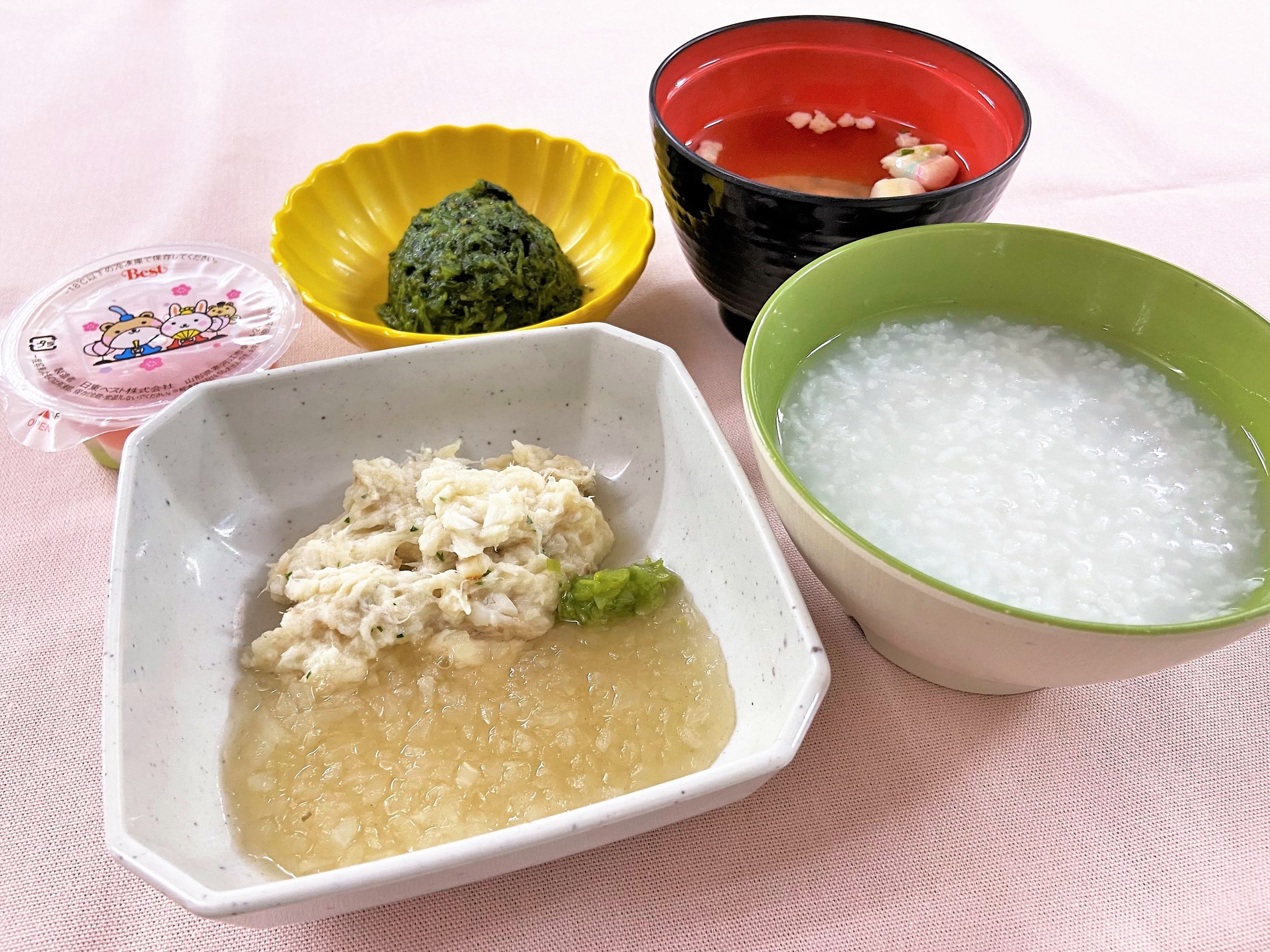 全粥・鯛の木の芽みそ焼き・菜の花のお浸し・すまし汁・三色花ゼリー