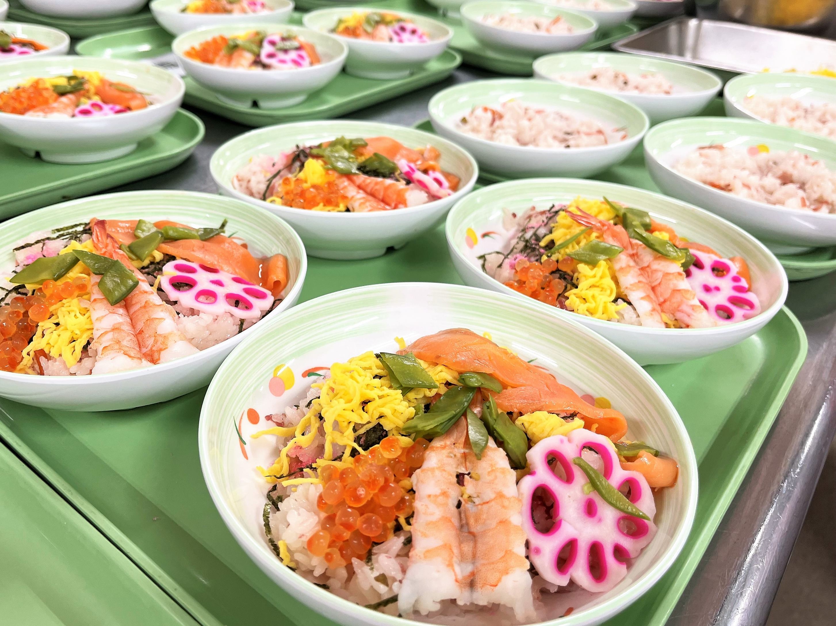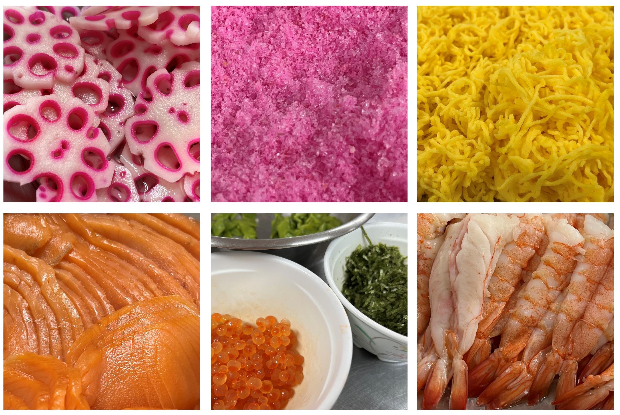 厨房には、花レンコン、桜でんぶ、錦糸たまご、スモークサーモン、イクラ、きざみのり、きぬさや、えびなど色鮮やかな具材が並びます。