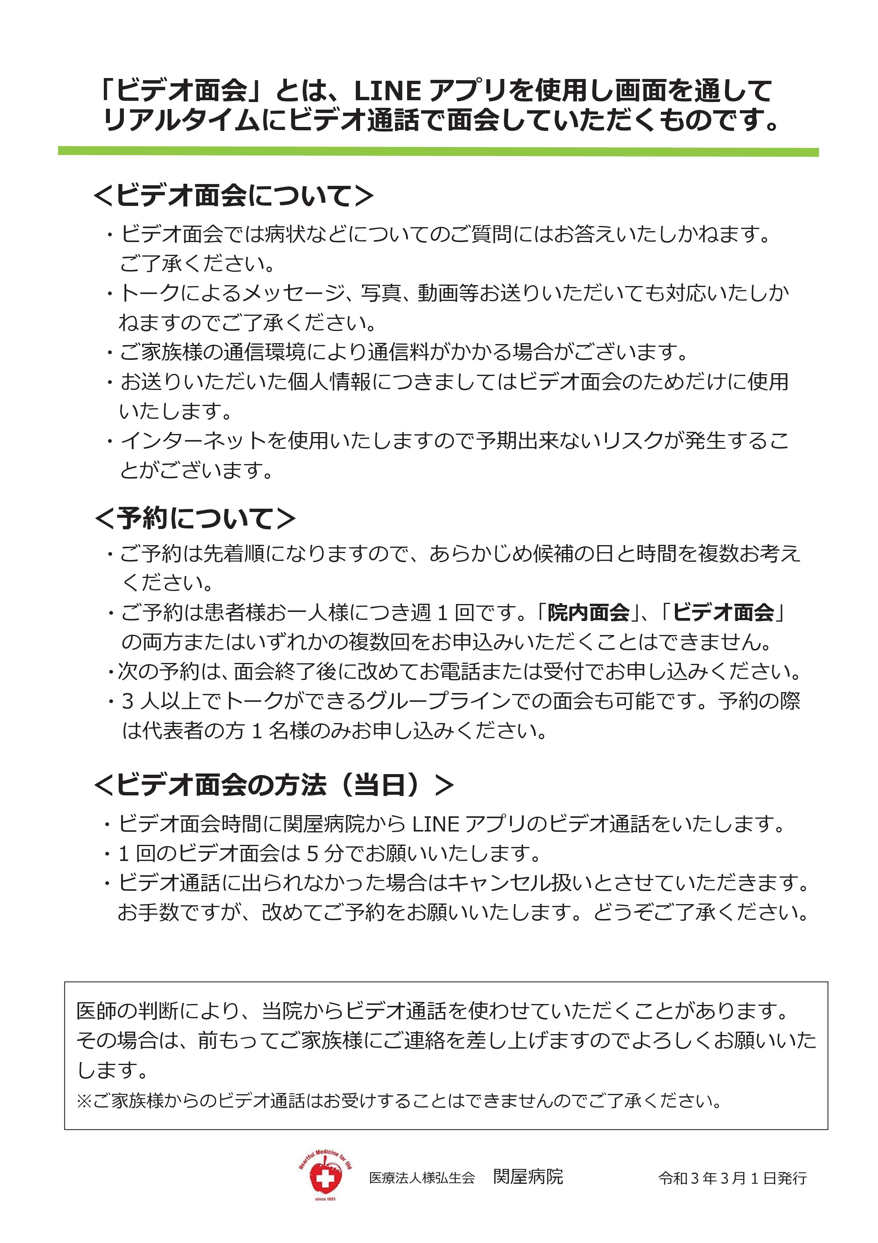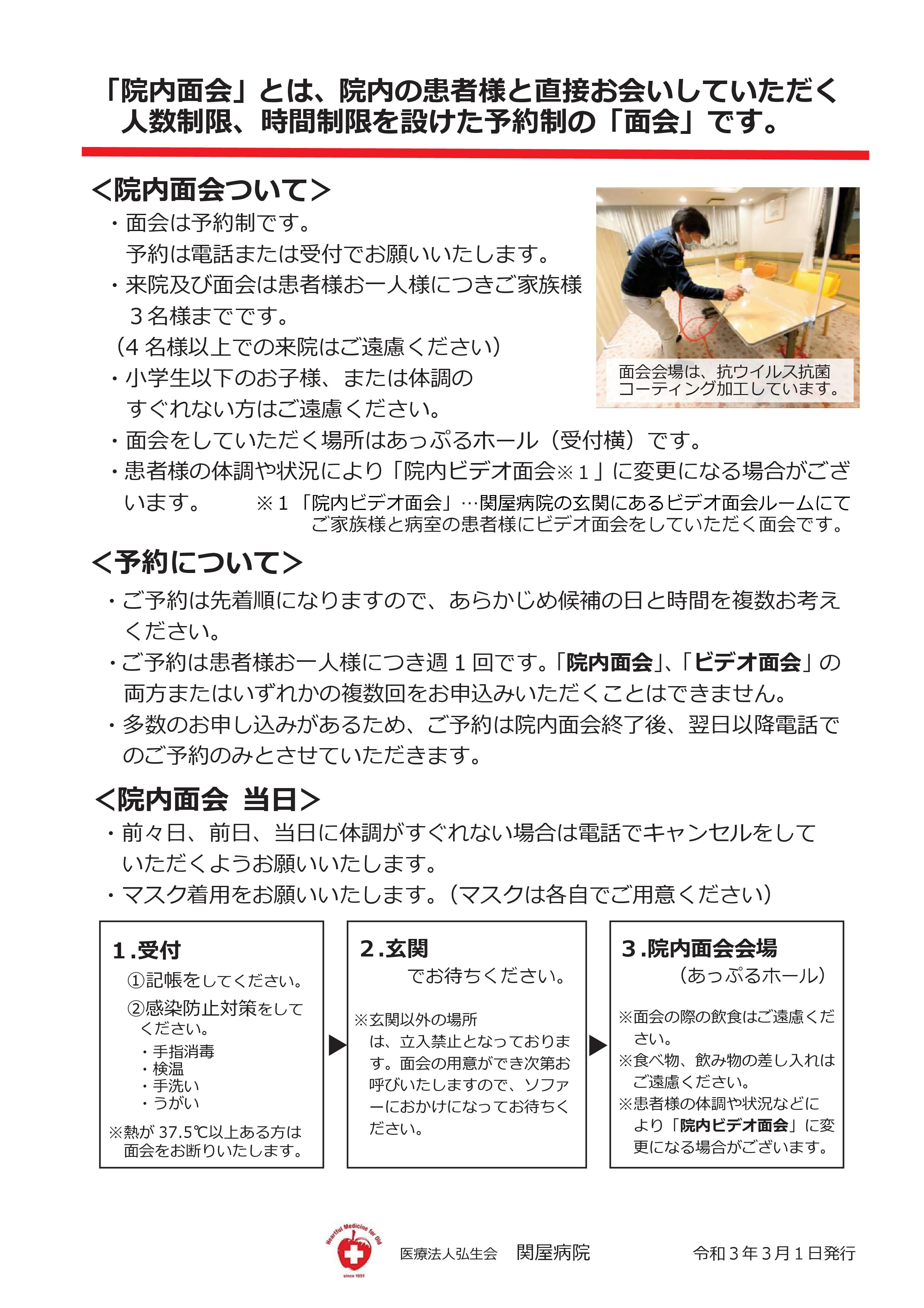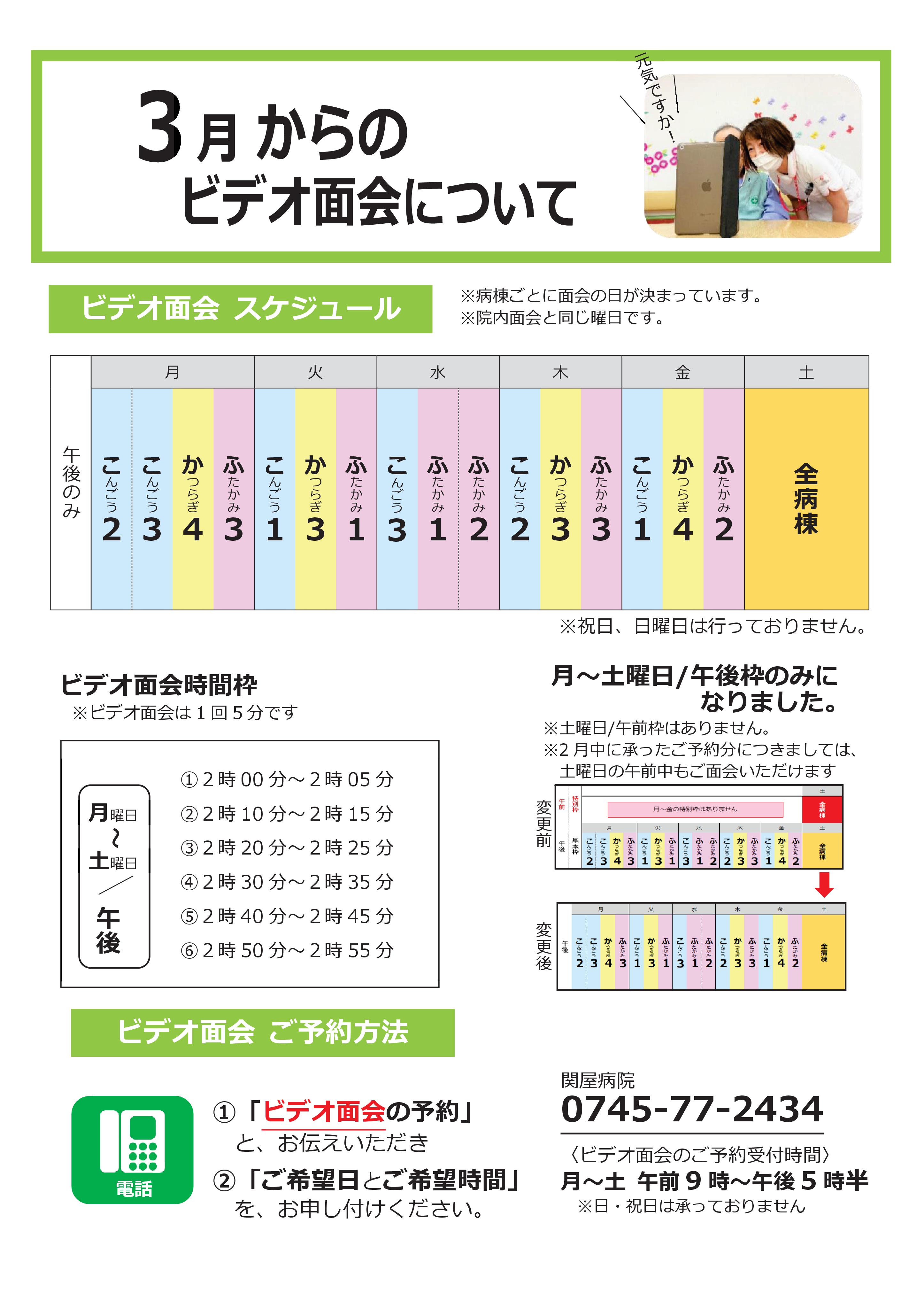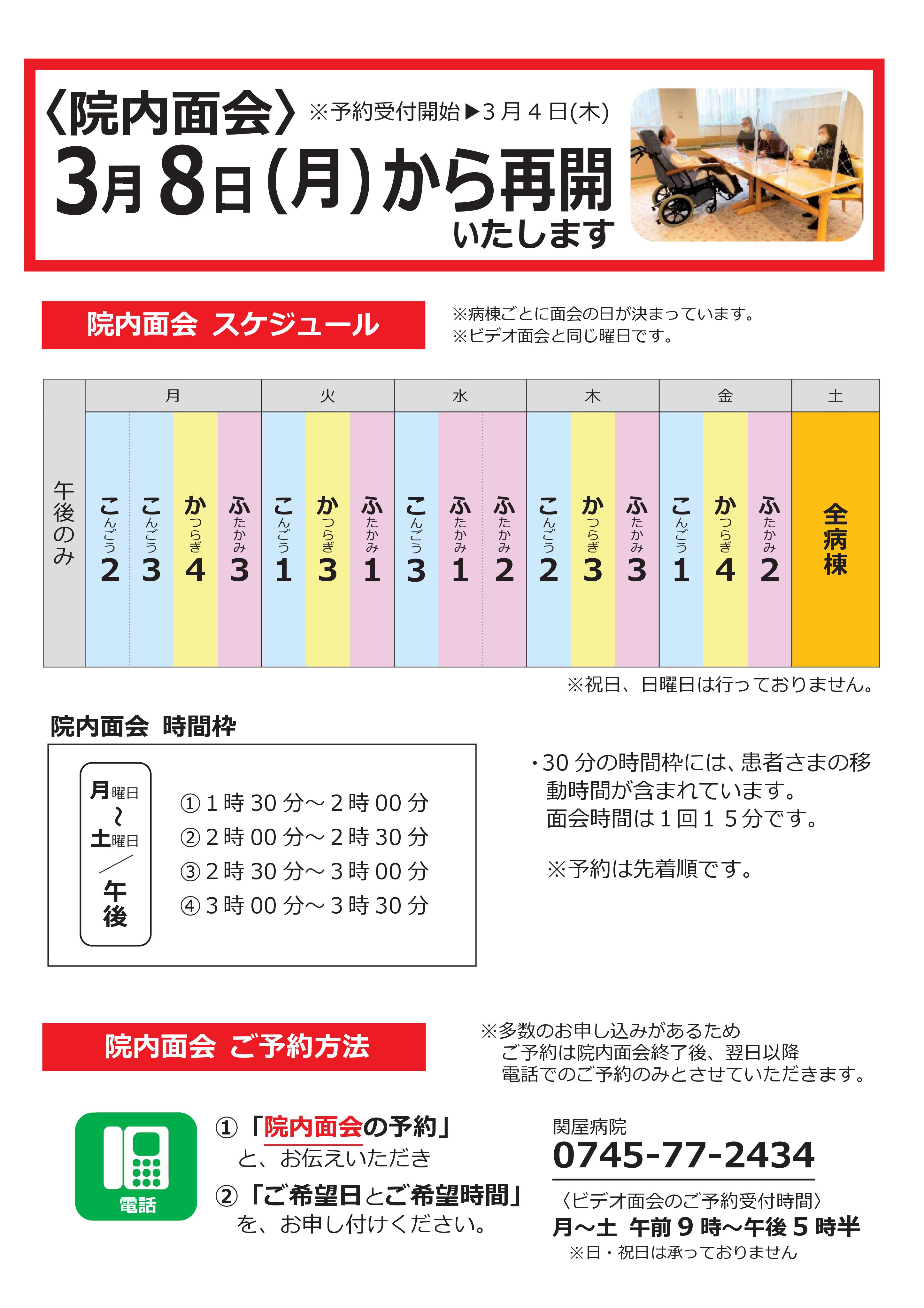 3月8日(月)から院内面会を再開いたします 2021.03.04 お知らせ 新型コロナウイルス感染症への警戒はいまだ必要な状態ではありますが、関西3府県の緊急事態宣言が解除されましたので当院では、感染防止対策を行いながら、3月8日(月)から院内面会を再開させていただきます。 院内面会の予約受付は3月4日(木)より開始いたします。 詳細は下記をご覧ください。 「院内面会」について↓ 「ビデオ面会」について↓