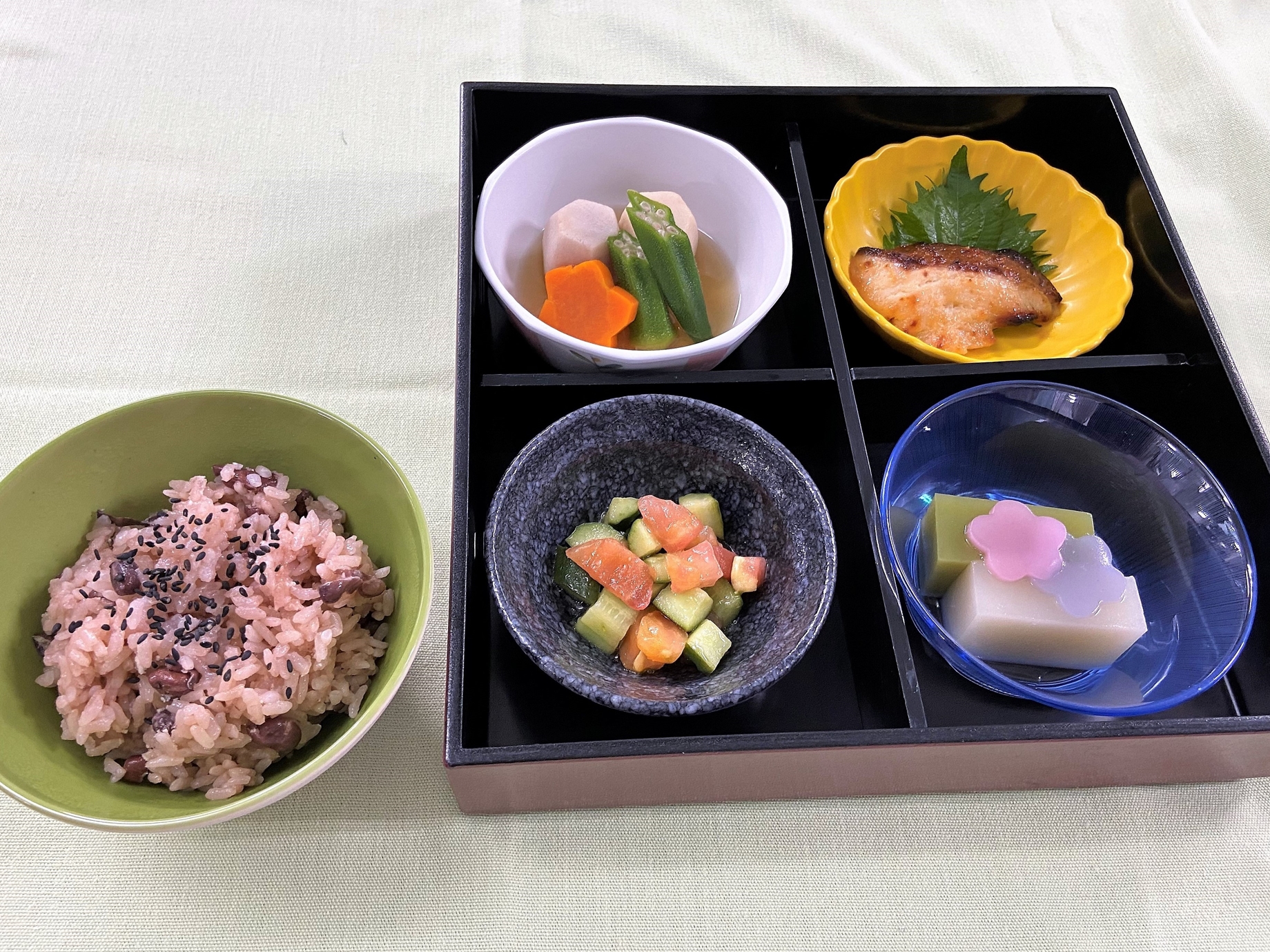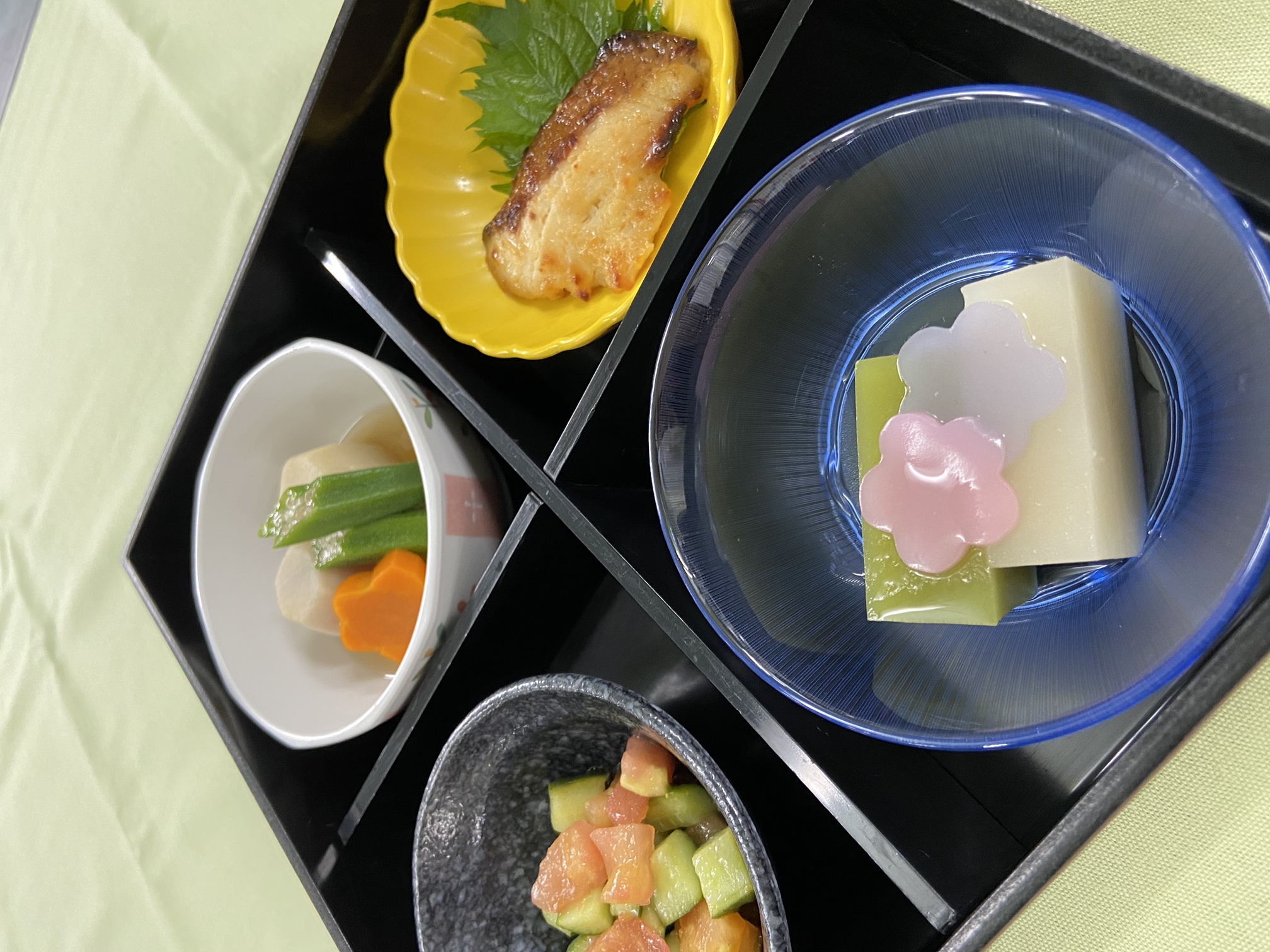 9日の「鯛めし」の「鯛」を患者さまにお喜びいただいたので、今回は調理法を変えて「鯛の西京焼き」を召し上がっていただきました。デザートは抹茶と白あんの2色ようかんの上に、あじさいの花びらようかんをのせました。