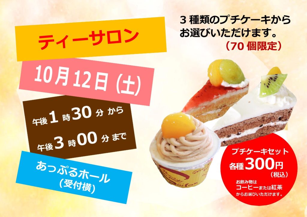 10月12日(土)のティーサロンはケーキとお飲み物の セットを70個限定、300円(税込)でご用意しております。ケーキは3種類からお選びいただけます。 当院のふたかみ棟屋上にある「あおぞら庭園」の散歩コースにはたくさんのコスモスが咲き始め、完成したウッドデッキからの二上山の眺めもご好評いただいております。