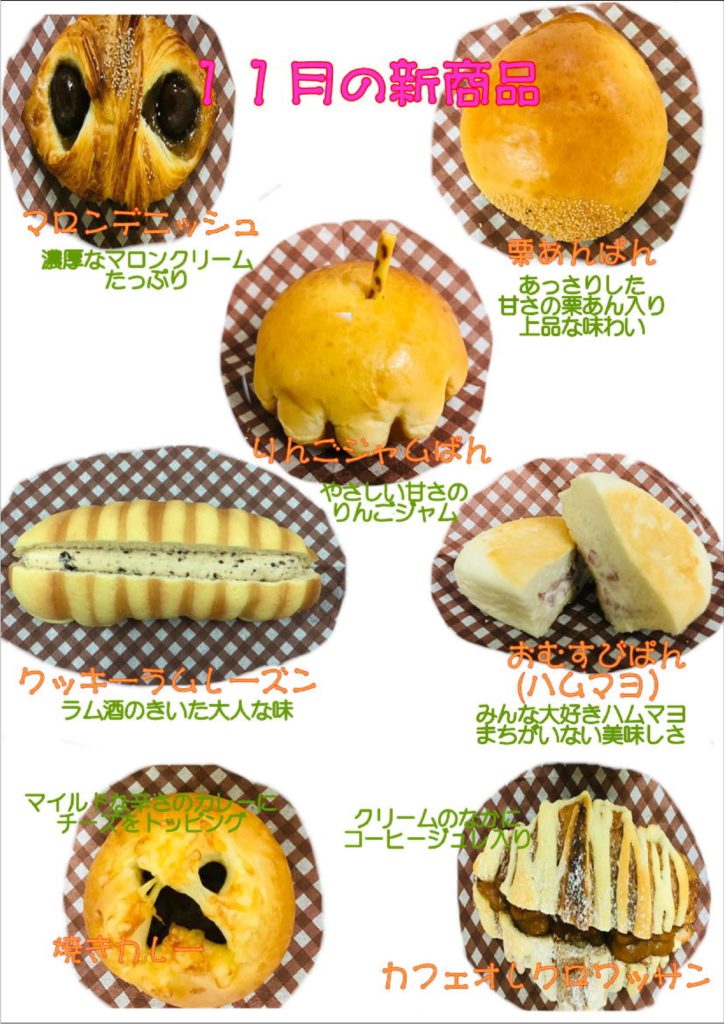 11月のパン販売は8日(金)、22日(金)です。 2019.11.07 お知らせ 11月8日(金)・22日(金)12:00~売り切れ次第終了 売店横にて 菓子パンからお惣菜パンまで人気のパンを取り揃えております。 売り切れが予想されますので、当院にお越しの際はお早めにどうぞ♪ 11月の新商品はこちらです。↓↓↓ パン屋:社会福祉法人以和貴会(いわきかい)ふぇりーちぇ
