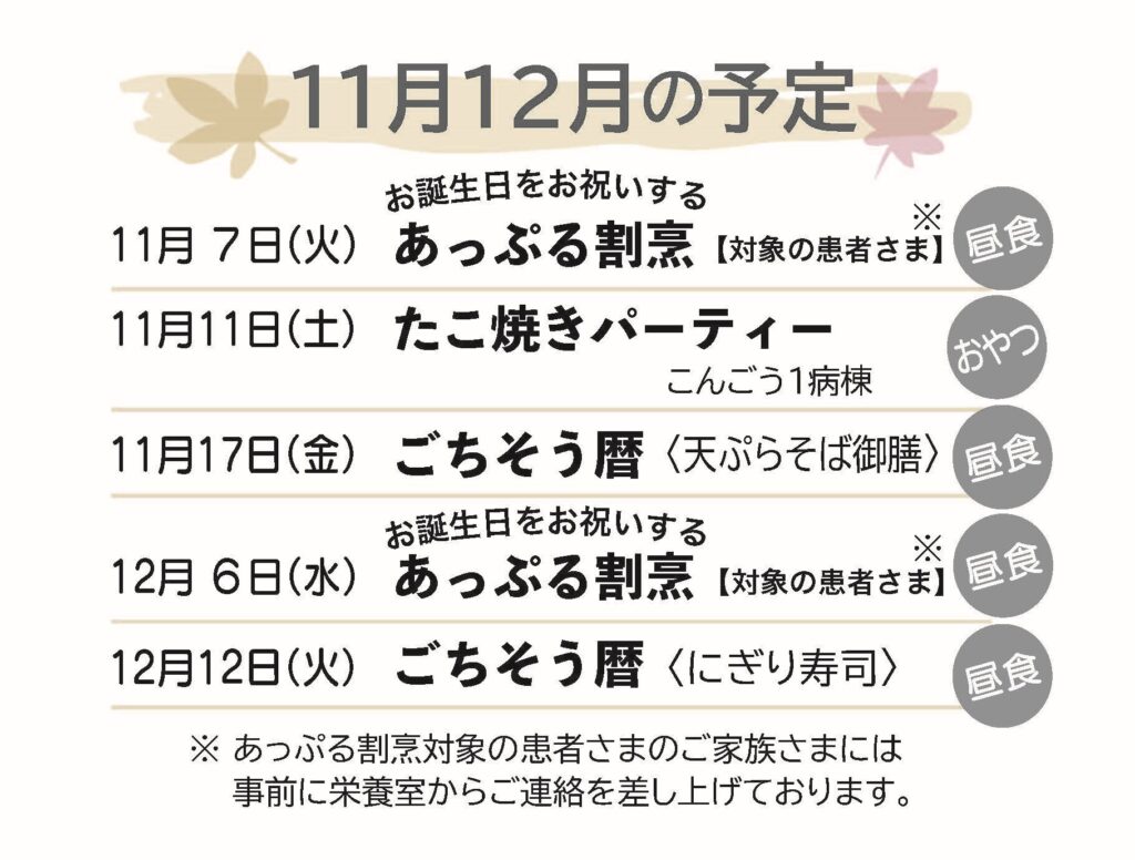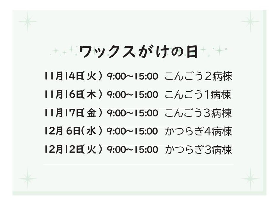 11月 12月の予定をお知らせいたします 2023.11.06 お知らせ ※ ワックスがけの間は一時的に患者さまの移動があります。 ご迷惑をおかけいたしますがご協力をお願いいたします。 ※ 予定は予告なく変更する場合がありますので、ご了承くださいませ。