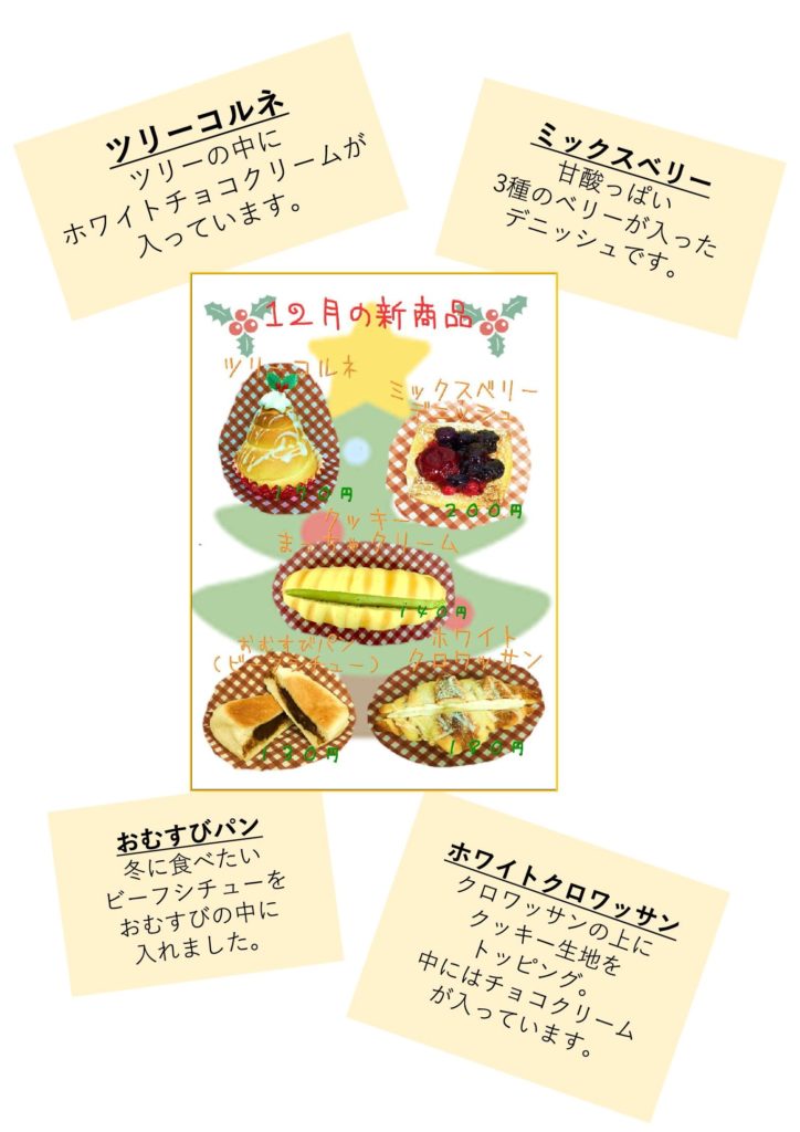12月のパンの新商品はこちらです。 2019.12.02 お知らせ 菓子パンからお惣菜パンまで人気のパンを取り揃えている パン屋「ふぇりーちぇ」さん。 ☆12月の販売日 12月13日(金)・27日(金)12:00~売り切れ次第終了です。 ☆場所 関屋病院 売店横 そして、12月の新商品は・・・ 売り切れが予想されますので、当院にお越しの際はお早めにどうぞ♪ パン屋:社会福祉法人以和貴会 (いわきかい)ふぇりーちぇ